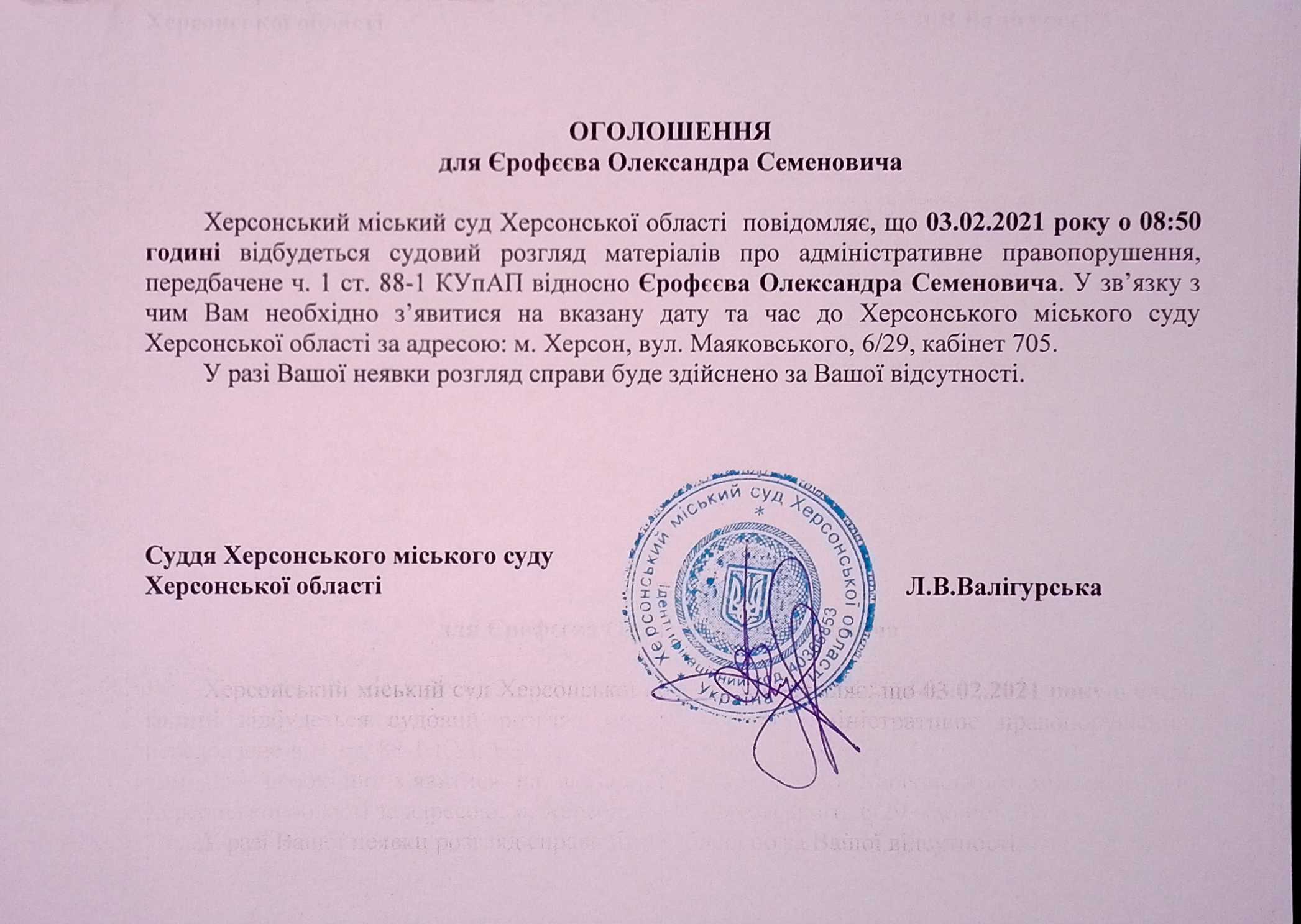 ОГОЛОШЕННЯ для Єрофєєва Олександра Семеновича