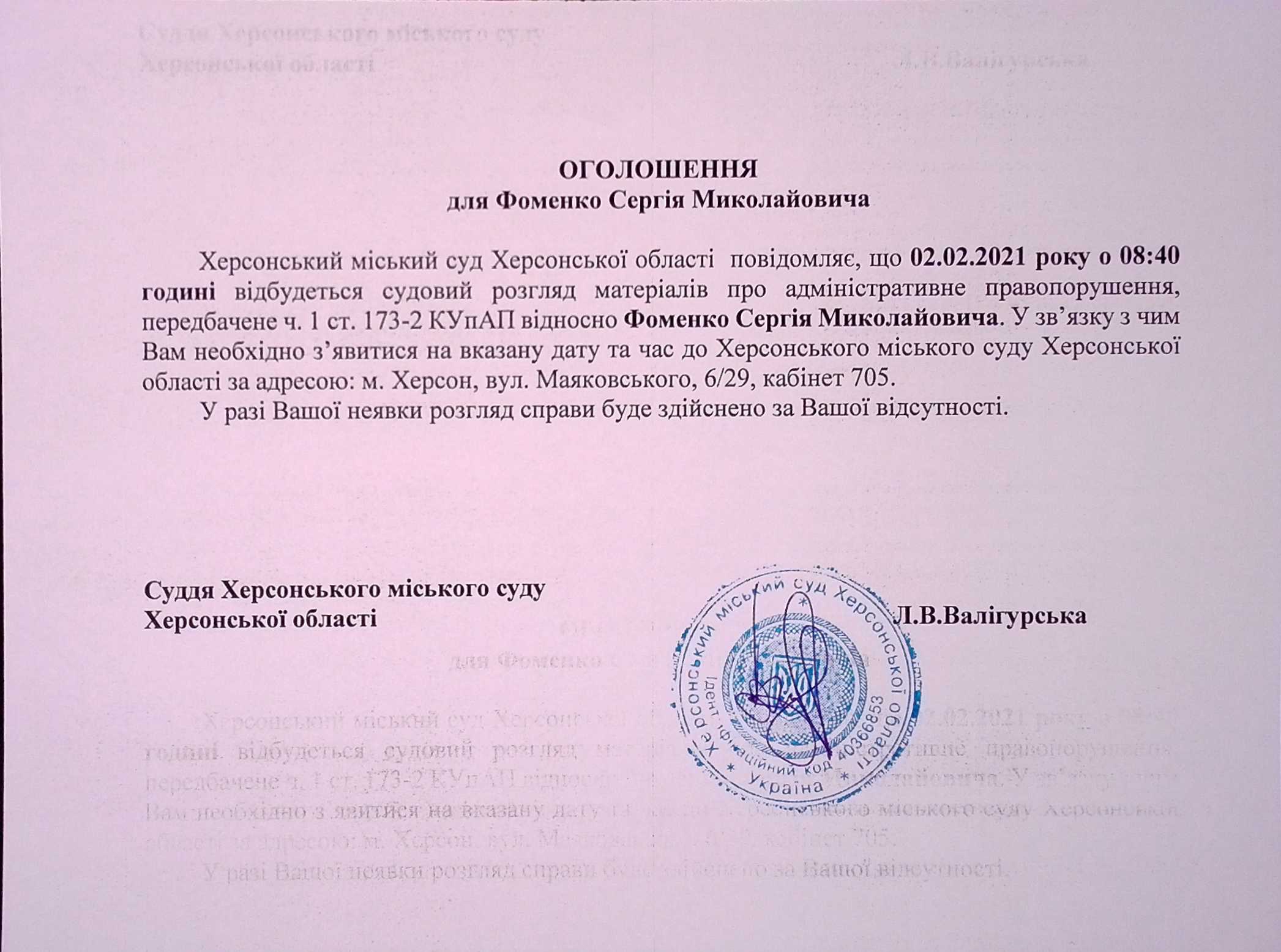 ОГОЛОШЕННЯ для Фоменко Сергія Миколайовича