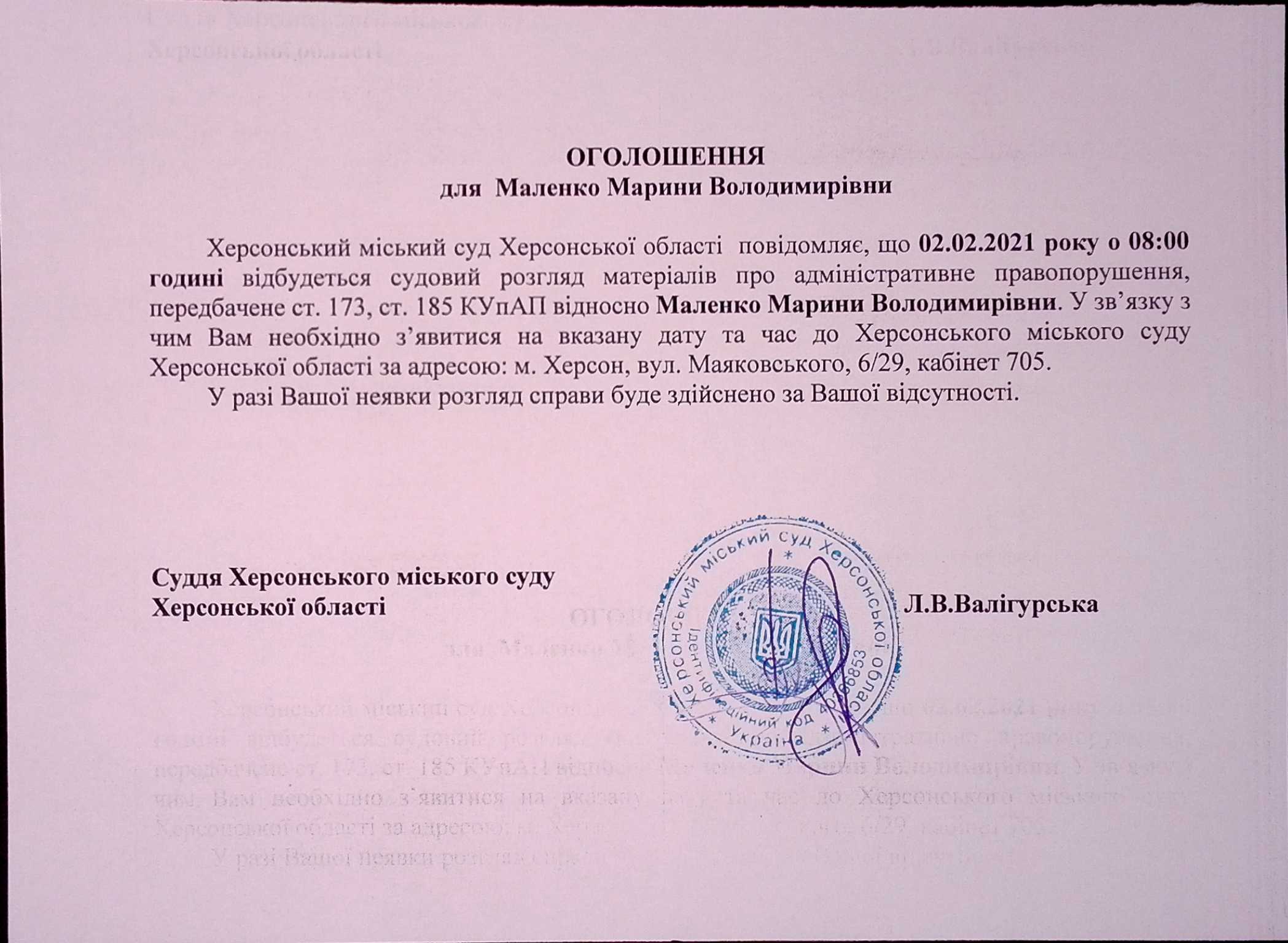 ОГОЛОШЕННЯ для Маленко Марини Володимирівни