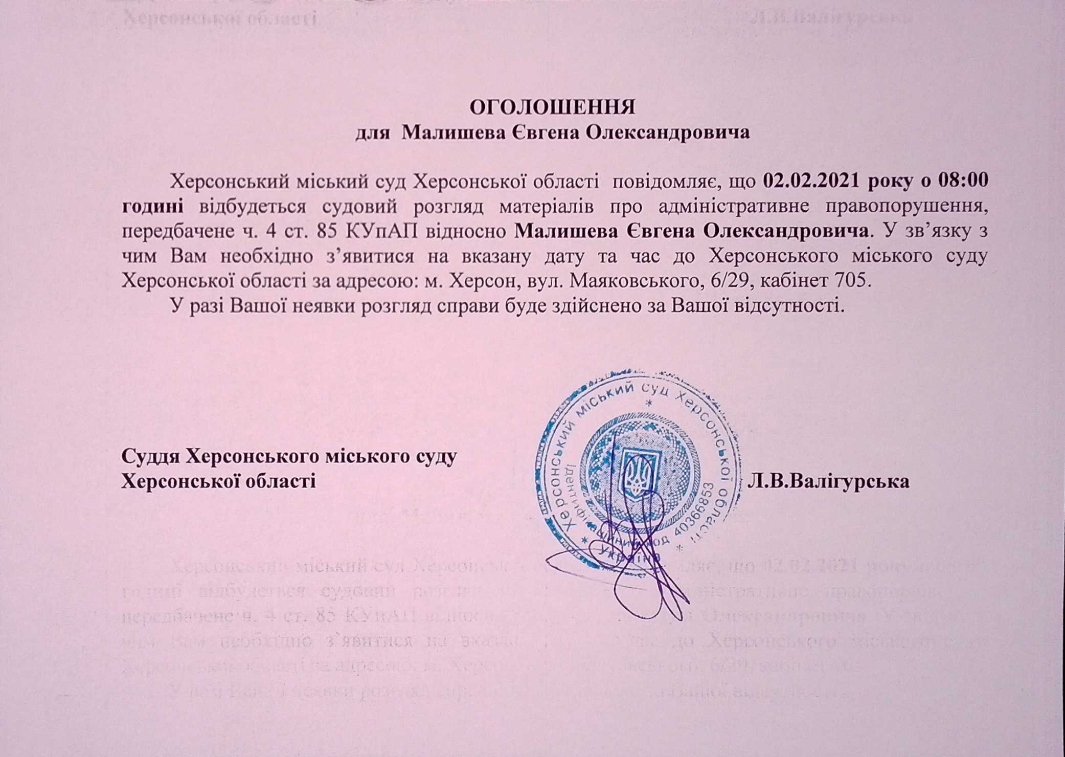 ОГОЛОШЕННЯ для Малишева Євгена Олександровича