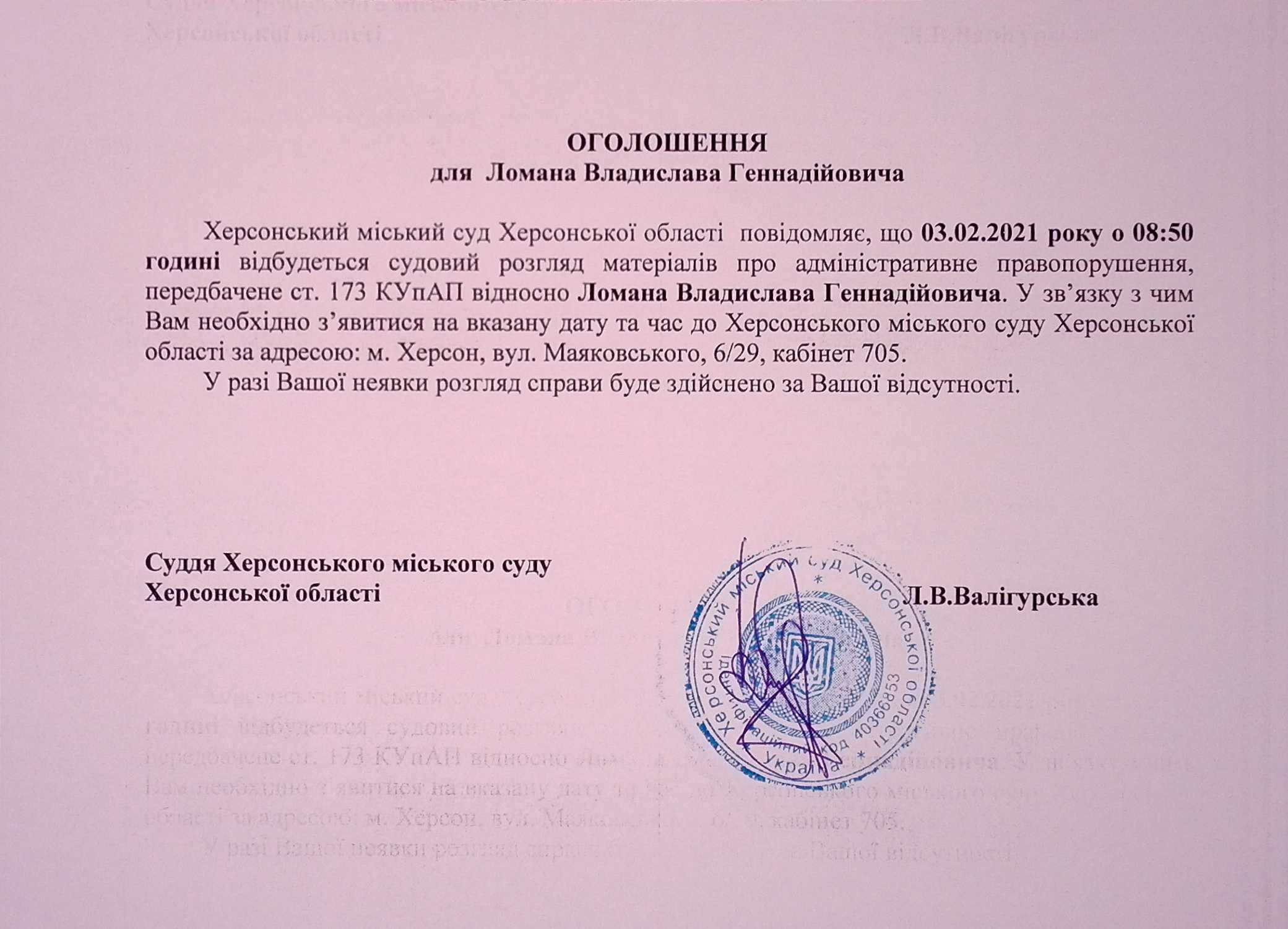 ОГОЛОШЕННЯ для Ломана Владислава Геннадійовича