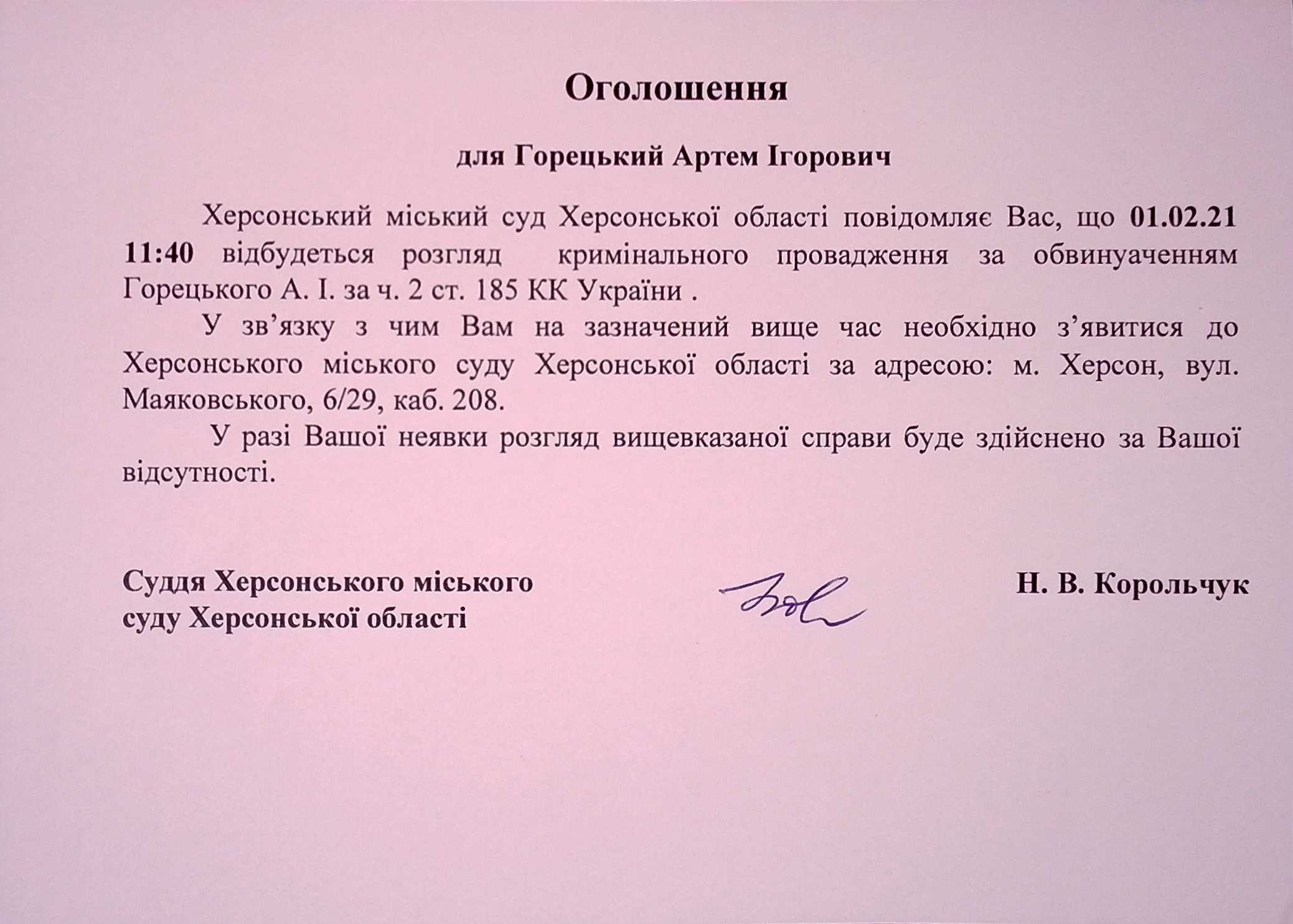 ОГОЛОШЕННЯ для Горецького Артема Ігоровича
