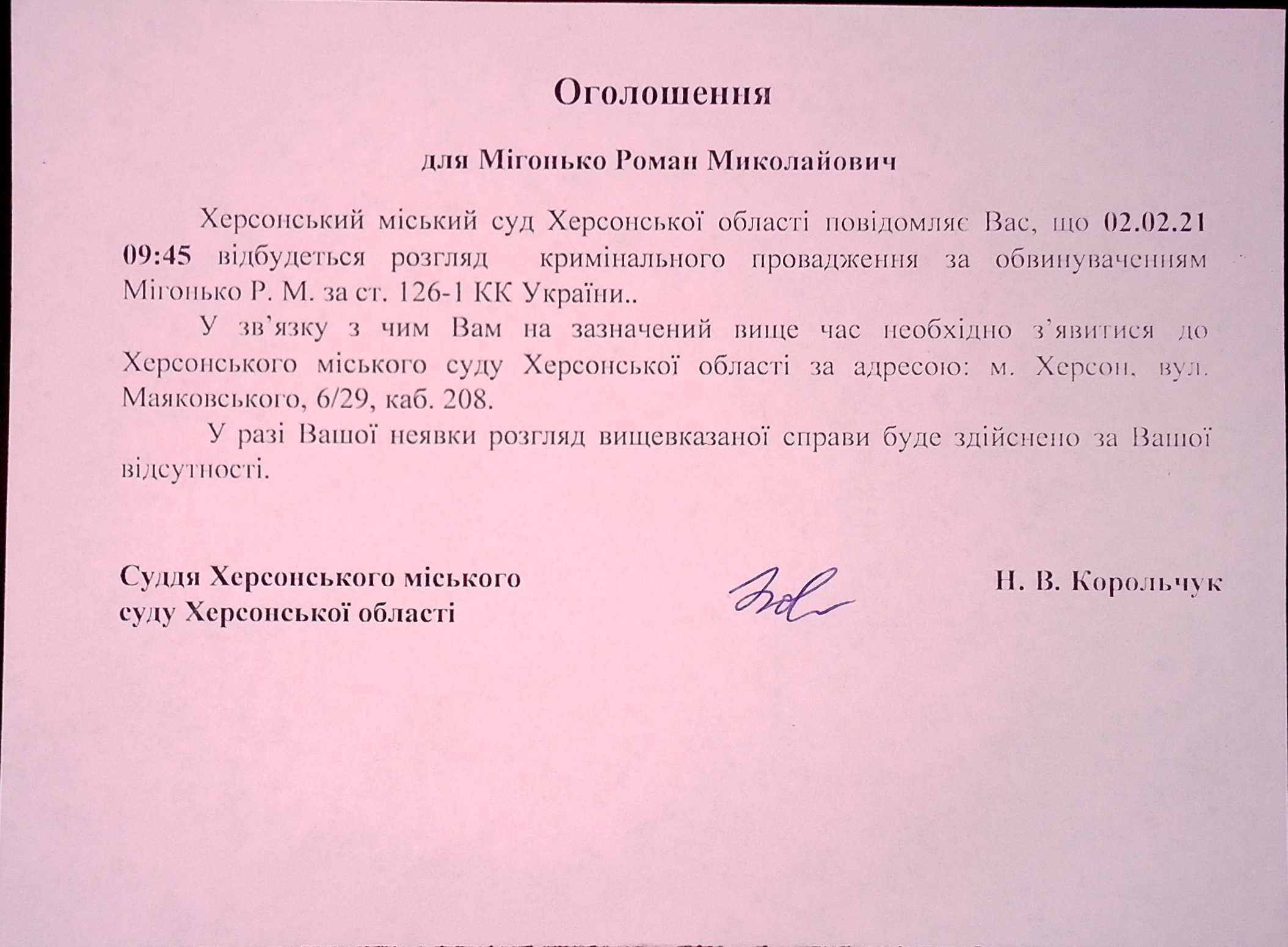 ОГОЛОШЕННЯ для Мігонько Романа Миколайовича