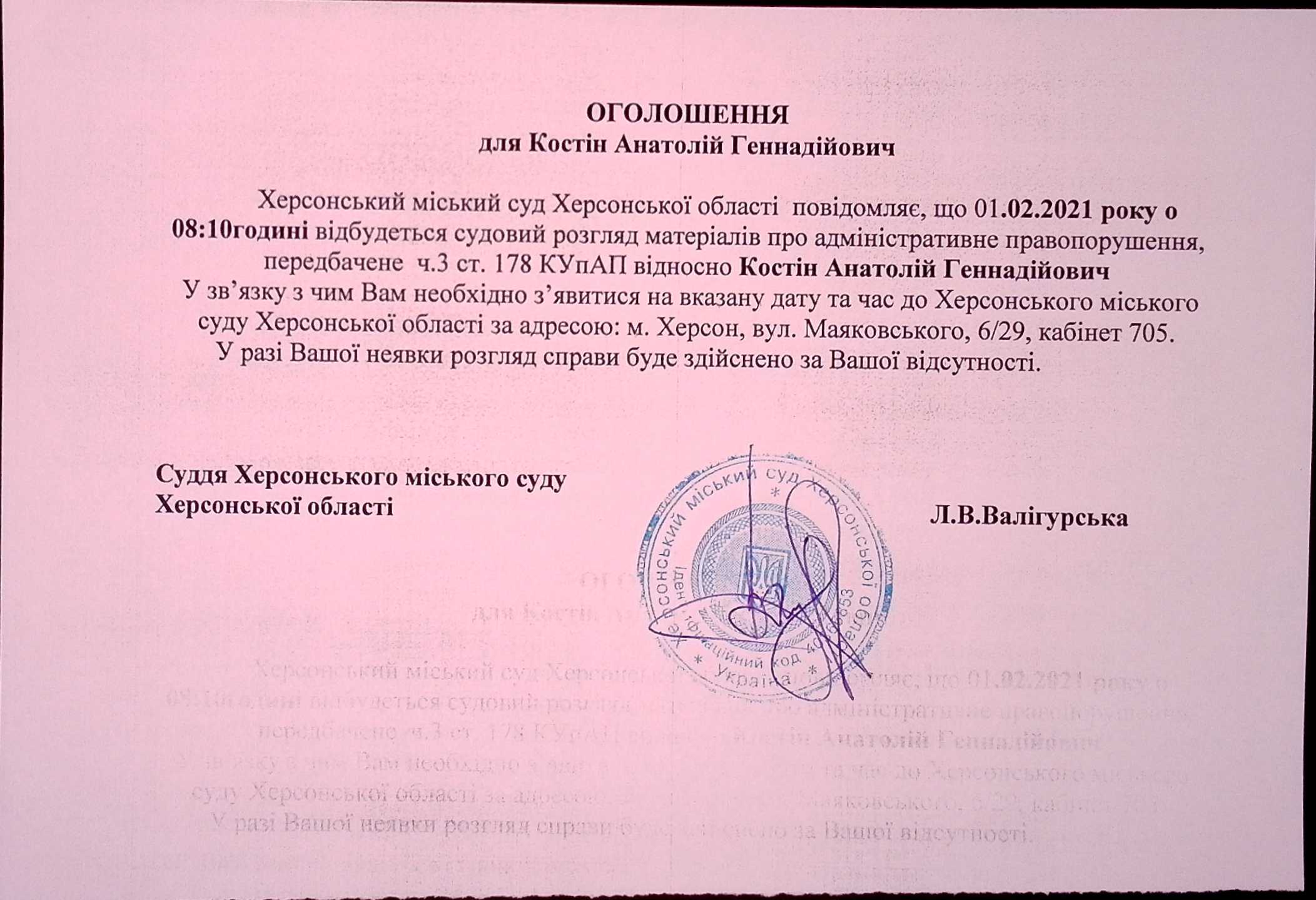 ОГОЛОШЕННЯ ПРО ВИКЛИК ДО СУДУ