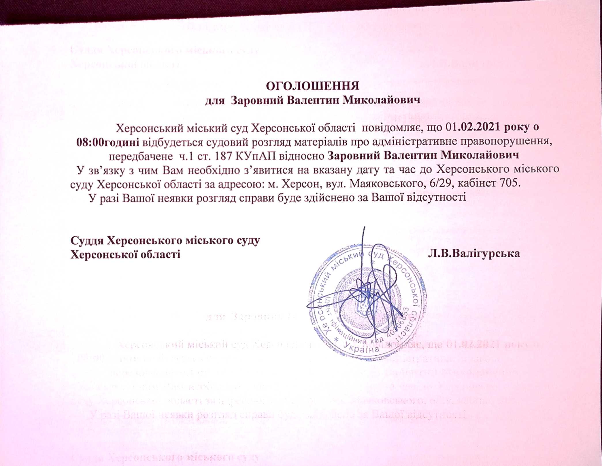ОГОЛОШЕННЯ для Заровного Валентина Миколайовича