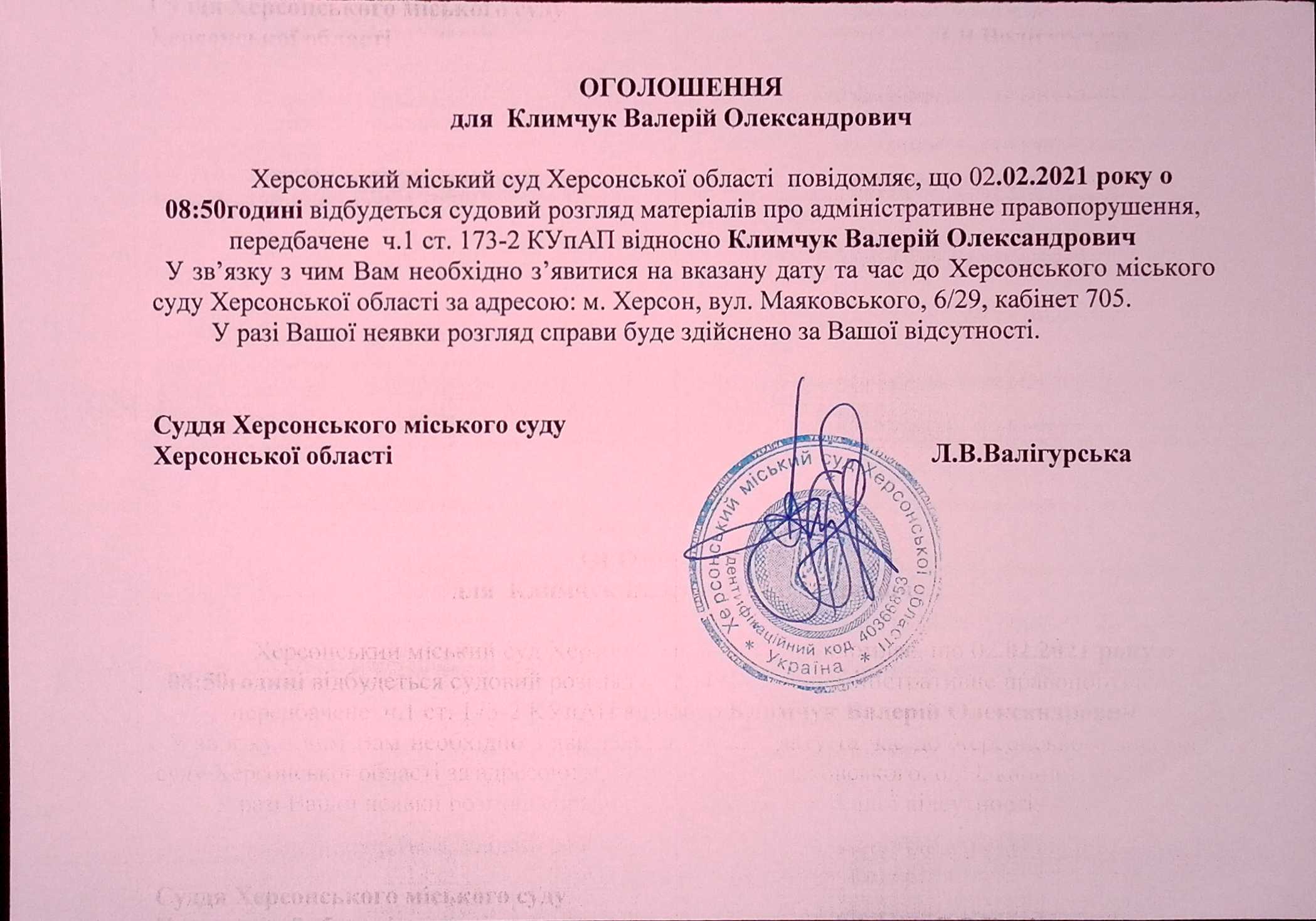 ОГОЛОШЕННЯ для Климчука Валерія Олександровича