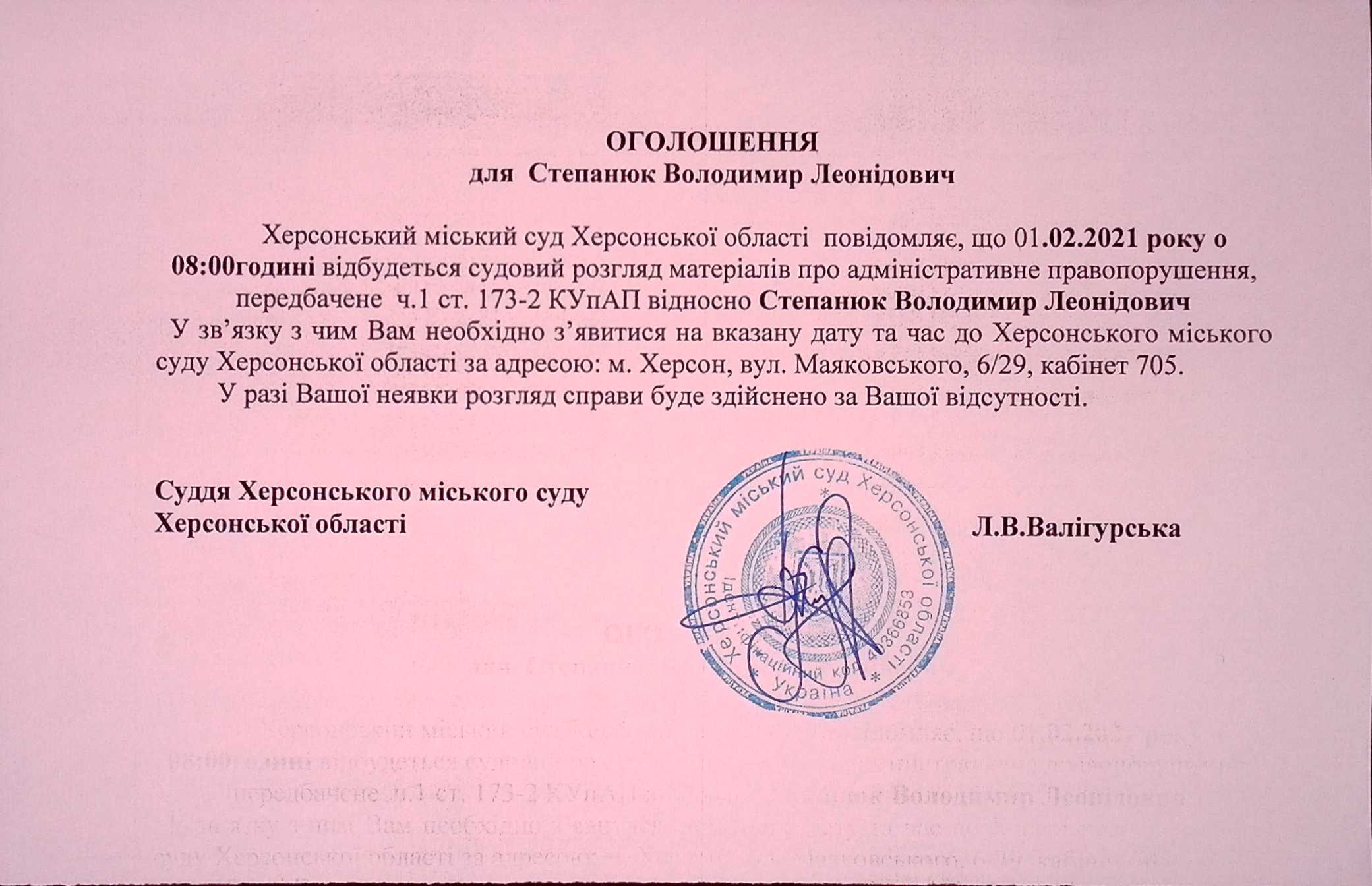 ОГОЛОШЕННЯ для Степанюка Володимира Леонідовича
