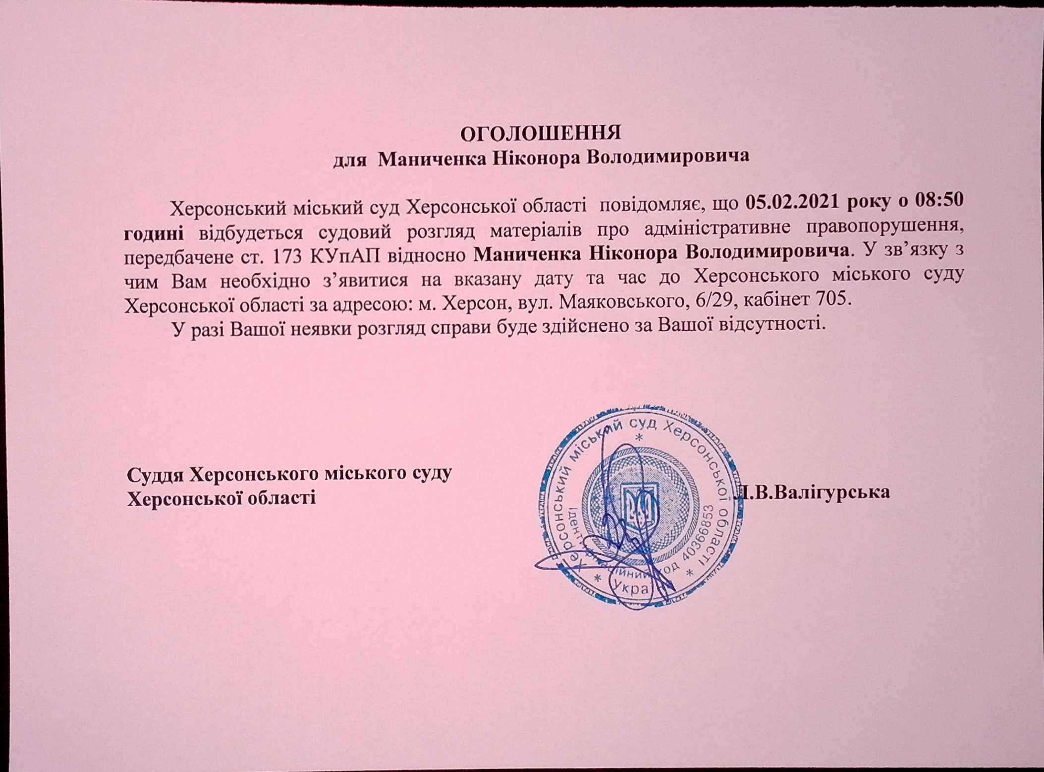 ОГОЛОШЕННЯ для Маниченка Ніконора Володимировича