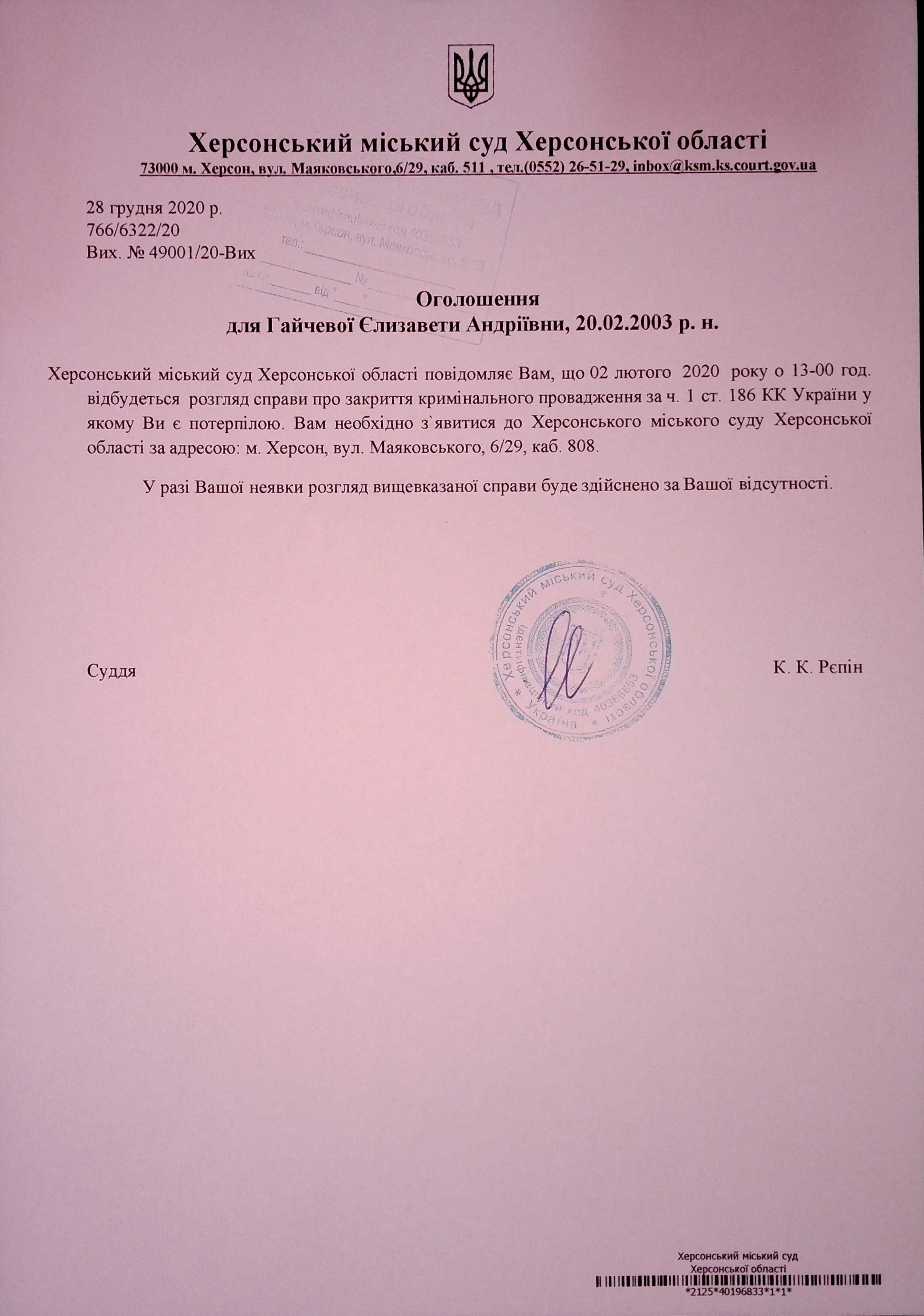 ОГОЛОШЕННЯ для Гайчевої Єлизавети Андріївни