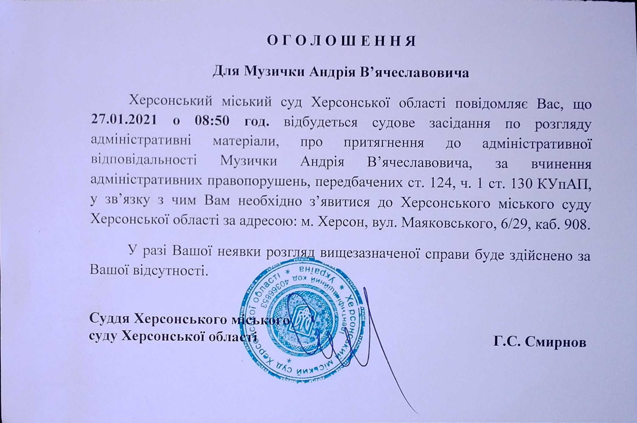 ОГОЛОШЕННЯ ПРО ВИКЛИК ДО СУДУ