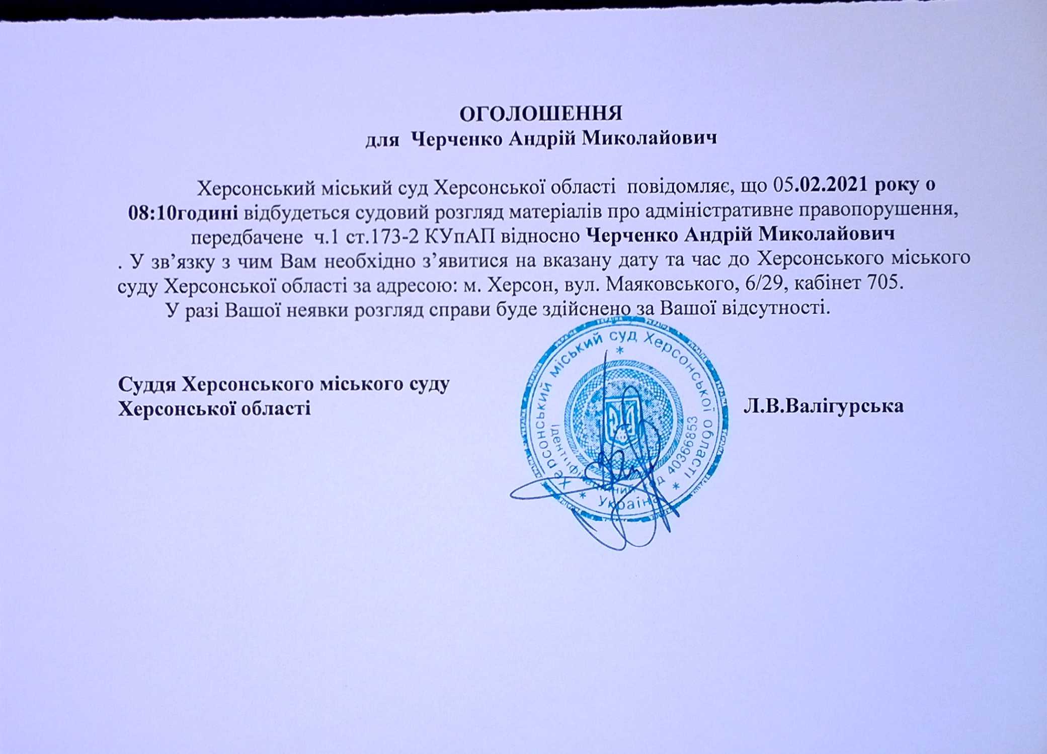 ОГОЛОШЕННЯ для Черченко Андрія Миколайовича