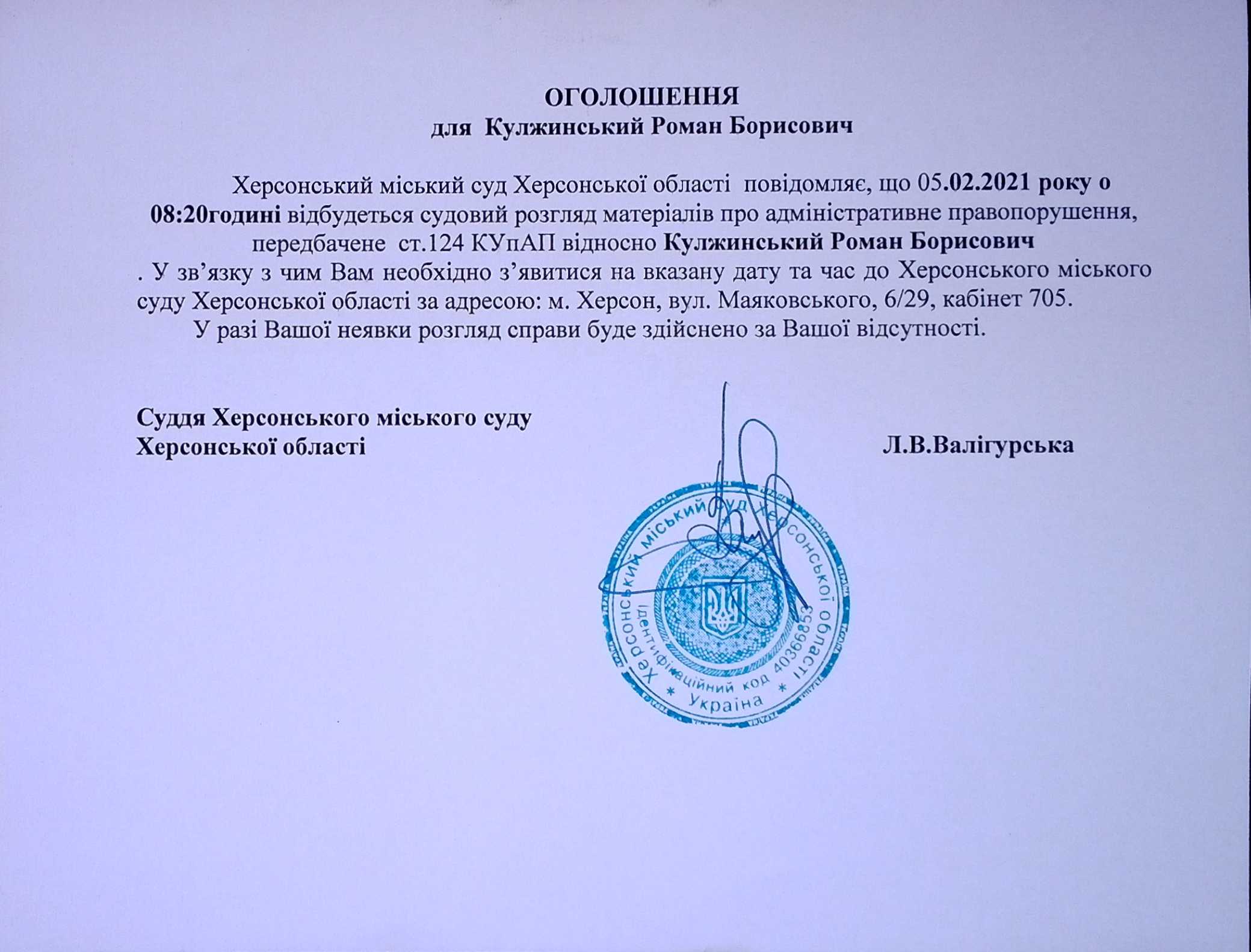 ОГОЛОШЕННЯ ПРО ВИКЛИК ДО СУДУ