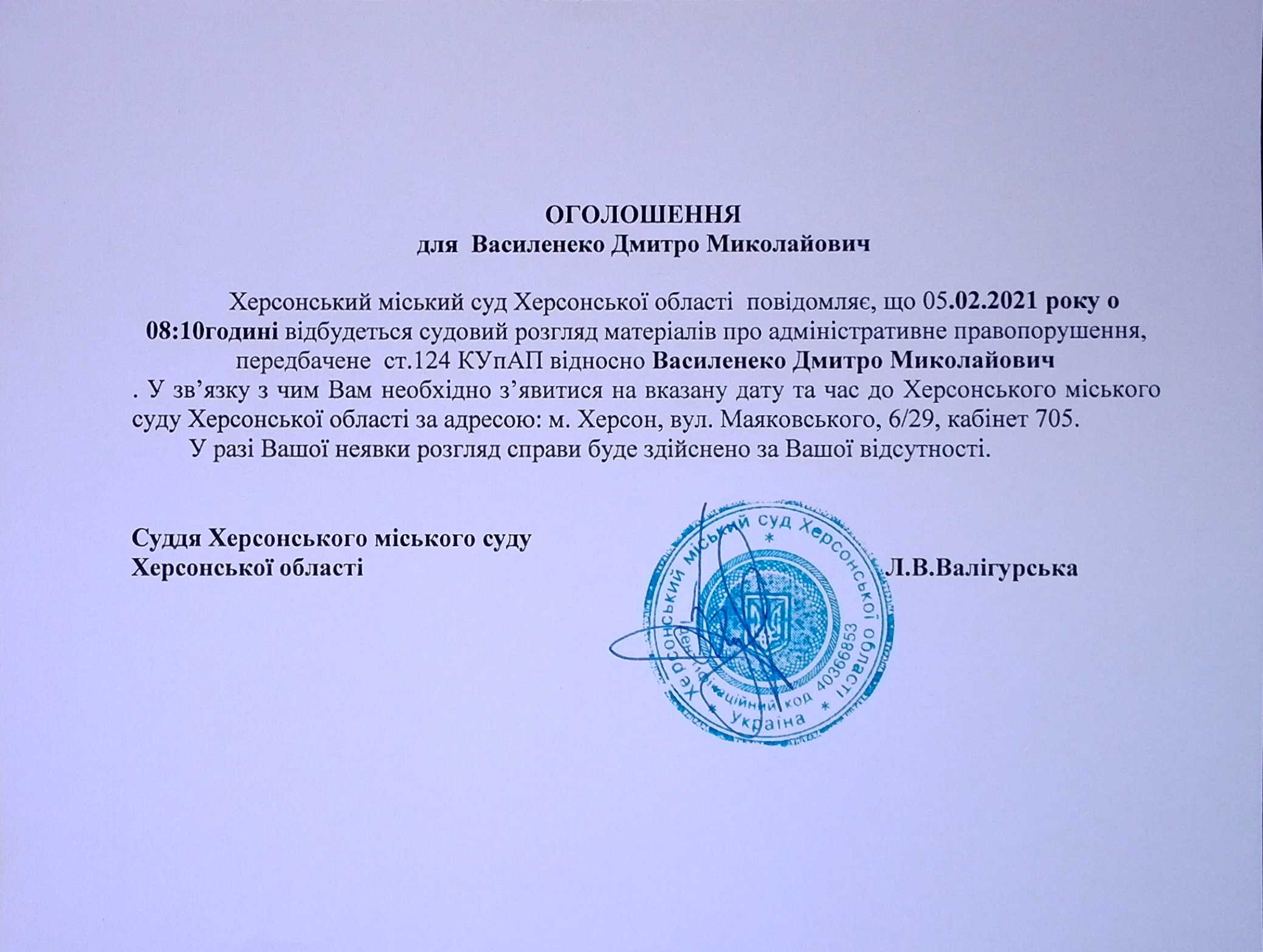 ОГОЛОШЕННЯ для Василенеко Дмитра Миколайовича