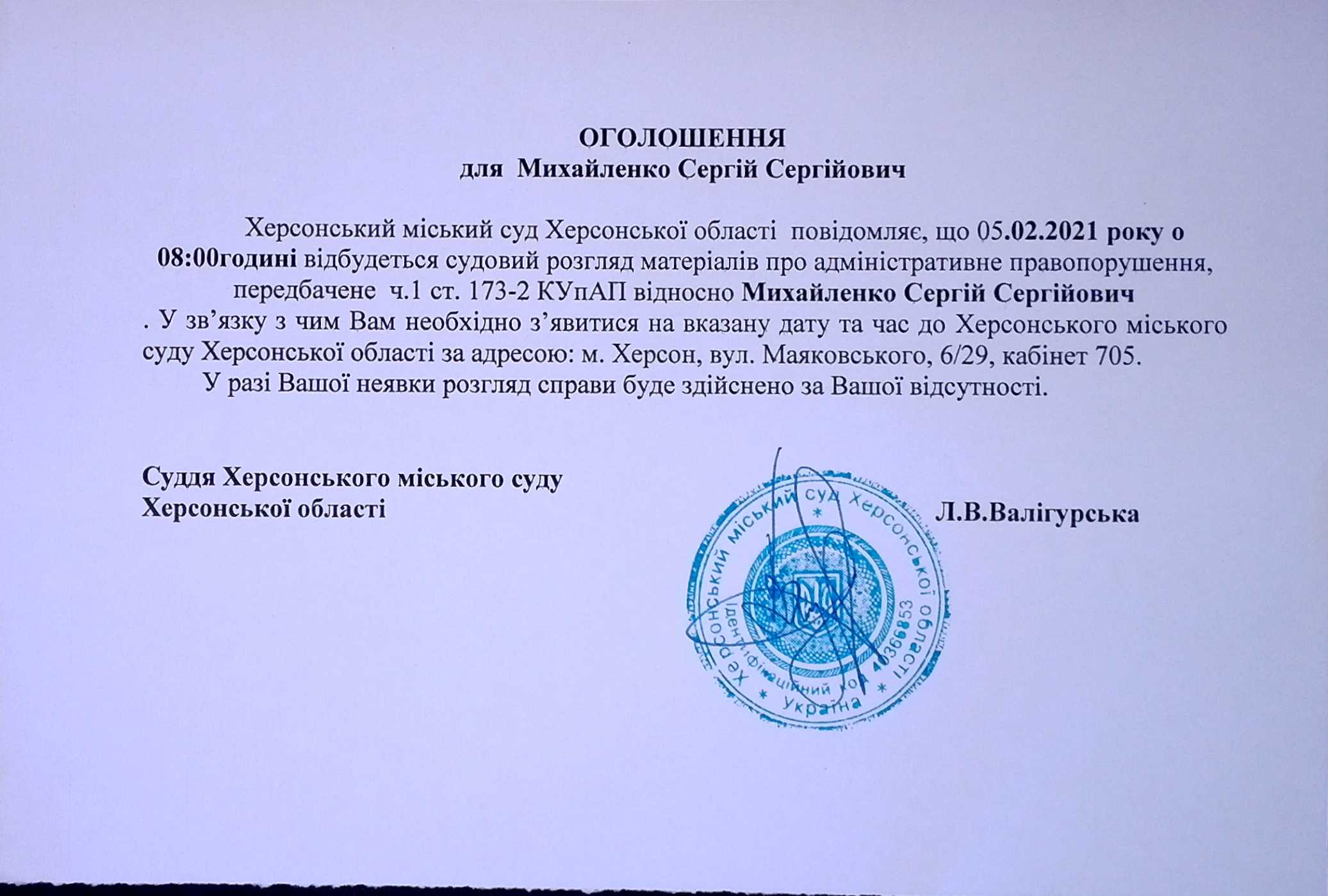 ОГОЛОШЕННЯ для Михайленко Сергія Сергійовича