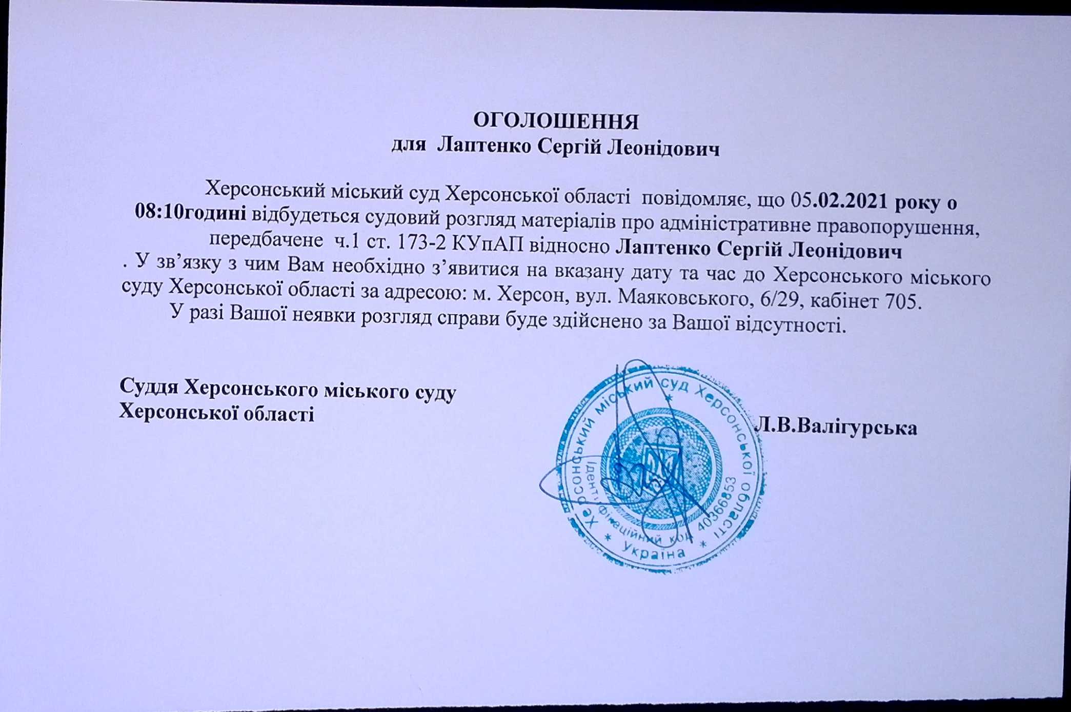 ОГОЛОШЕННЯ для Лаптенко Сергія Леонідовича
