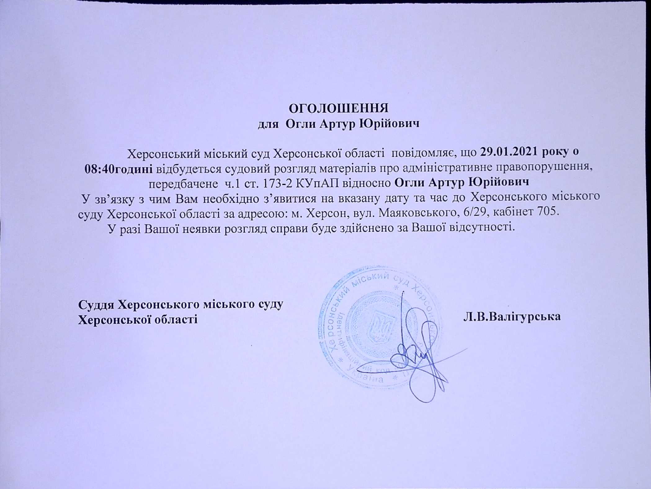 ОГОЛОШЕННЯ для Огли Артура Юрійовича