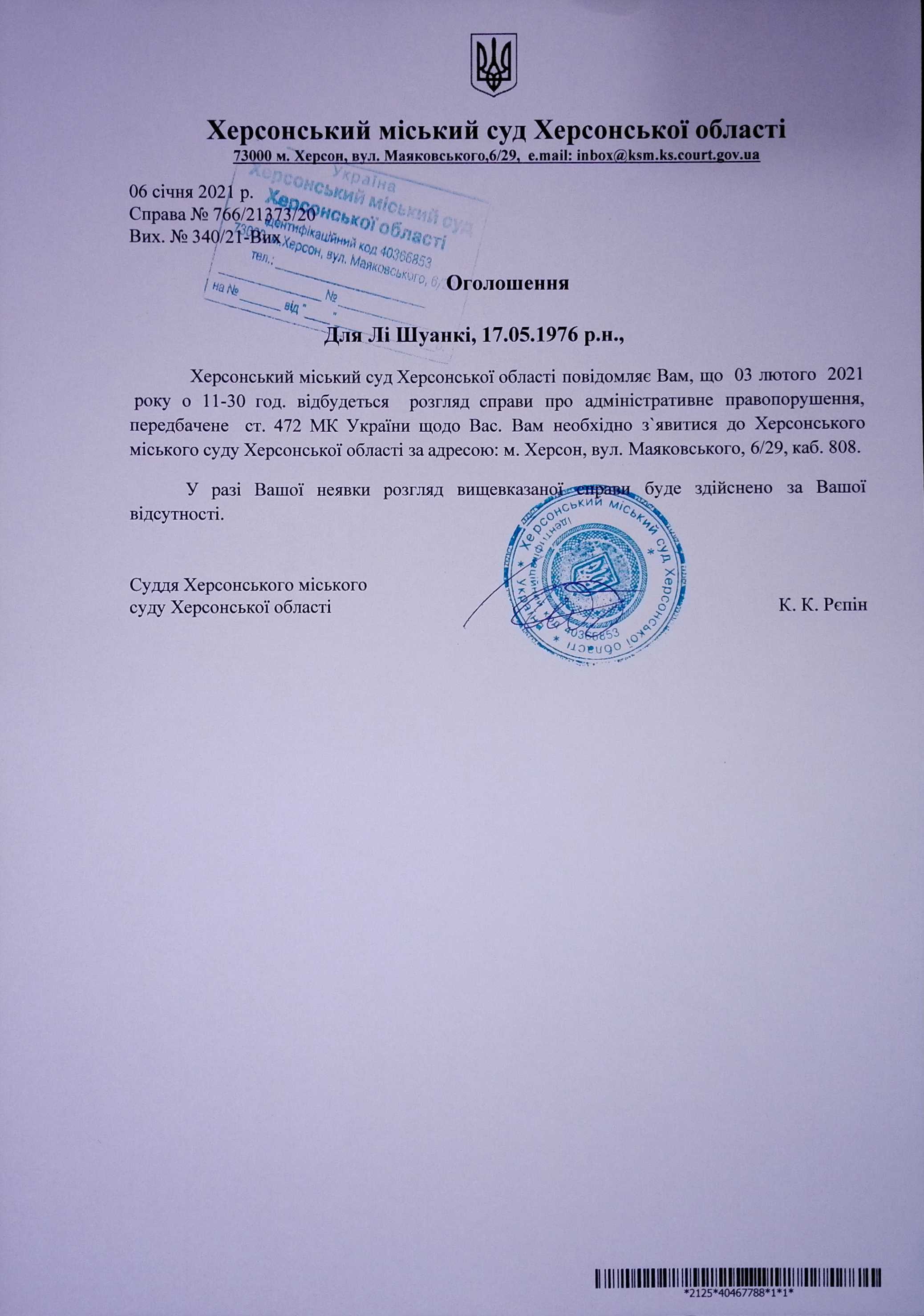 ОГОЛОШЕННЯ ПРО ВИКЛИК ДО СУДУ