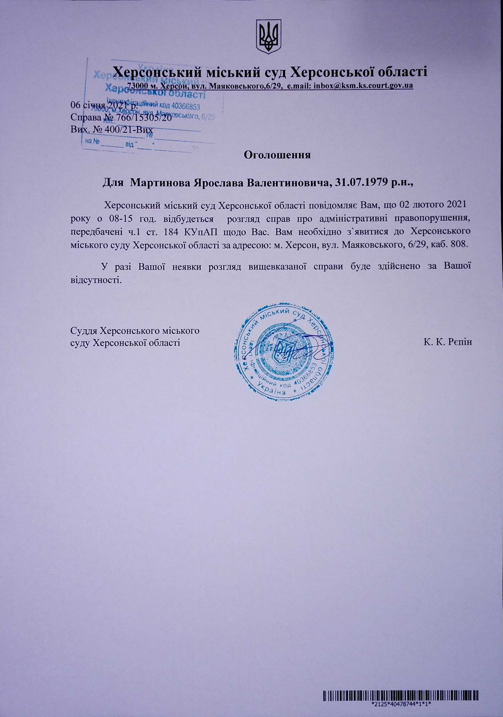 ОГОЛОШЕННЯ для Мартинова Ярослава Валентиновича
