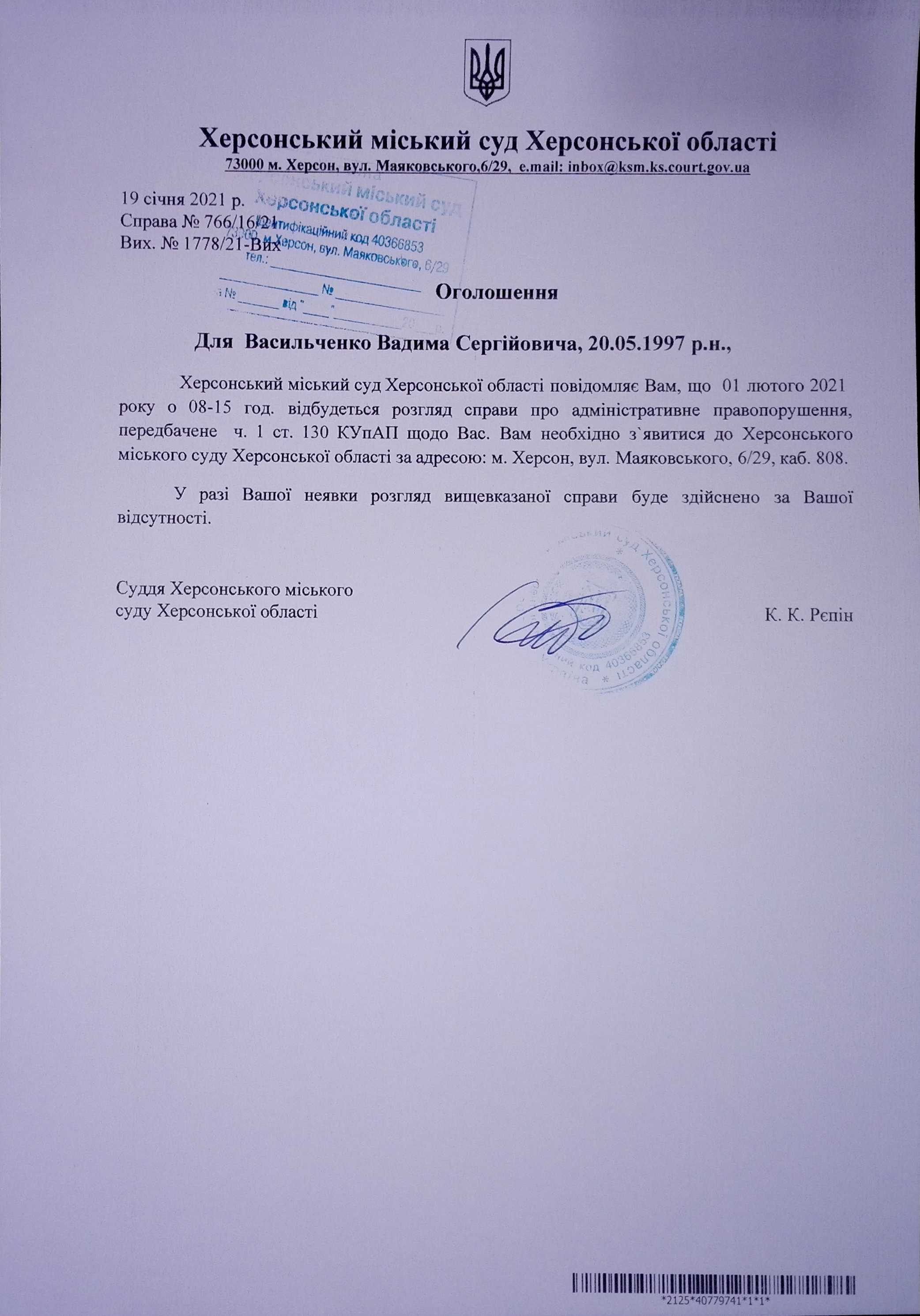 ОГОЛОШЕННЯ для Васильченко Вадима Сергійовича