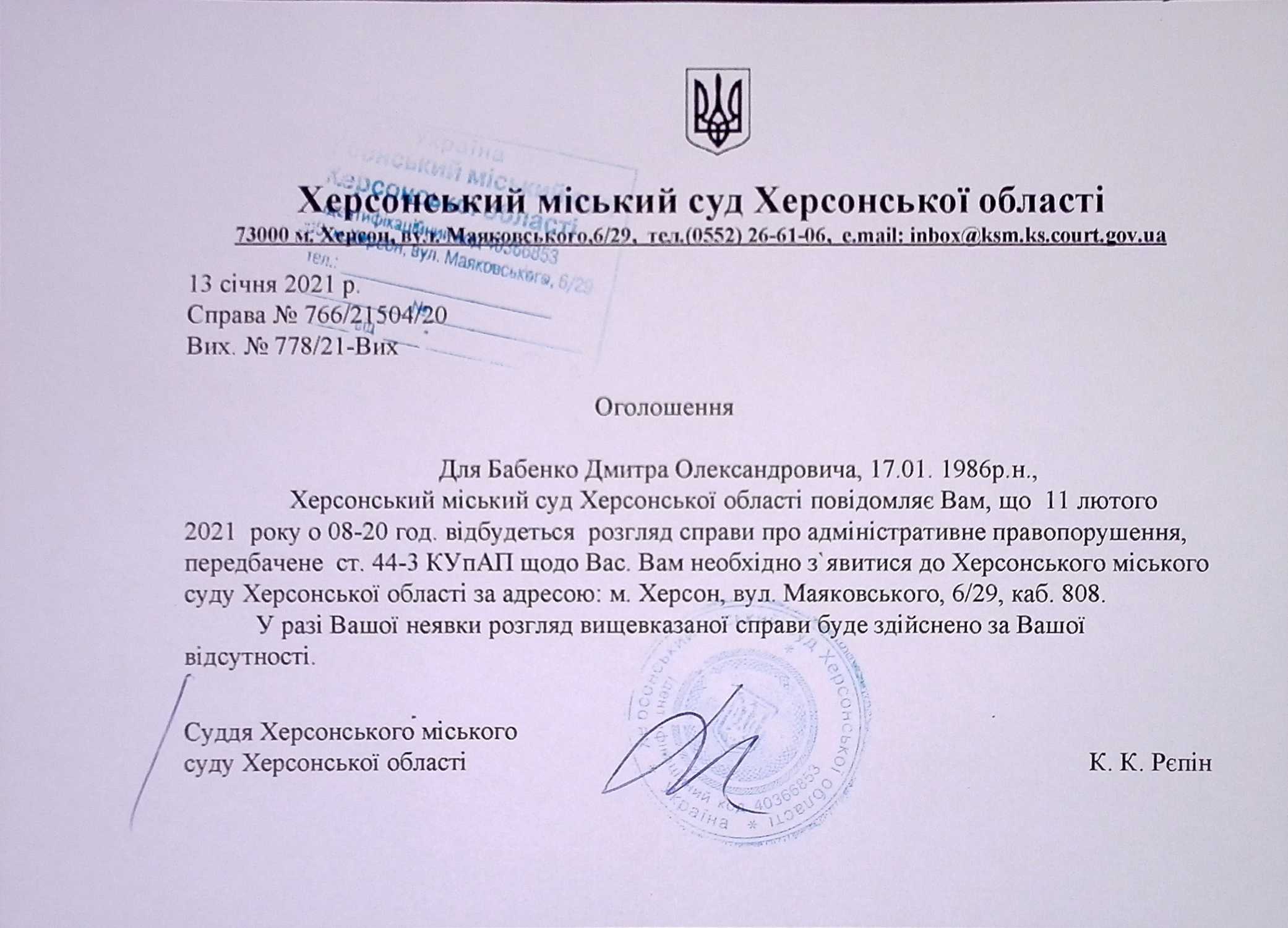 ОГОЛОШЕННЯ ПРО ВИКЛИК ДО СУДУ