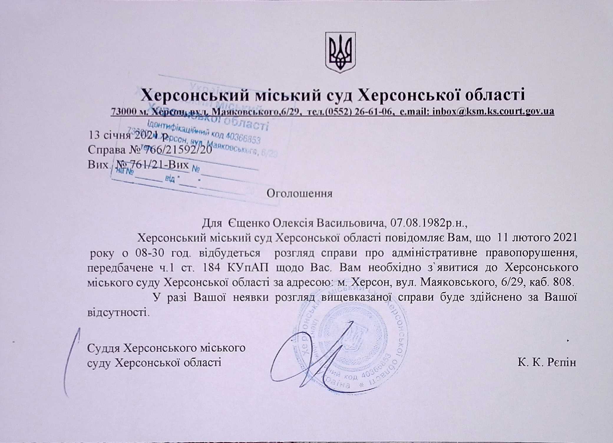 ОГОЛОШЕННЯ ПРО ВИКЛИК ДО СУДУ