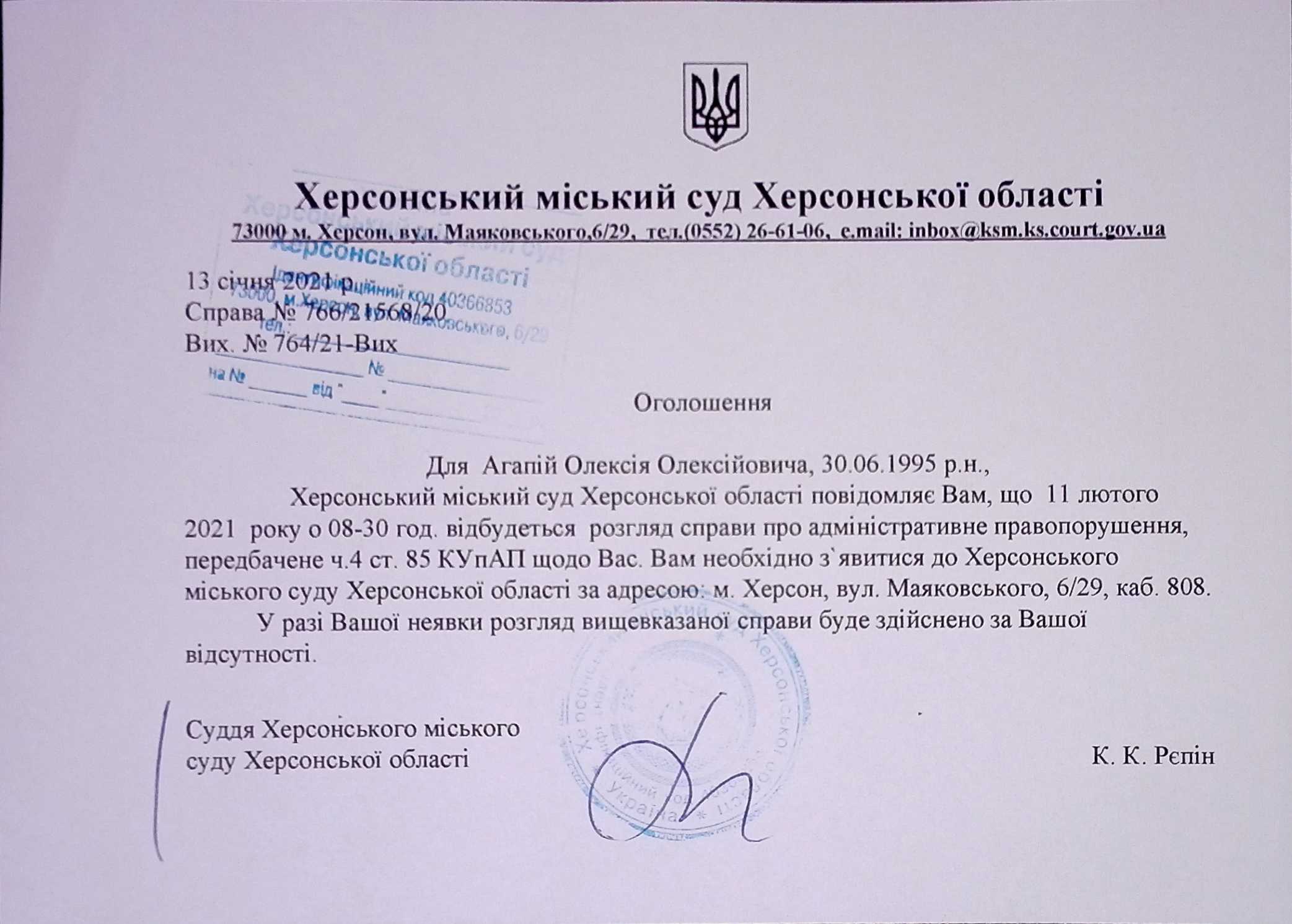 ОГОЛОШЕННЯ ПРО ВИКЛИК ДО СУДУ