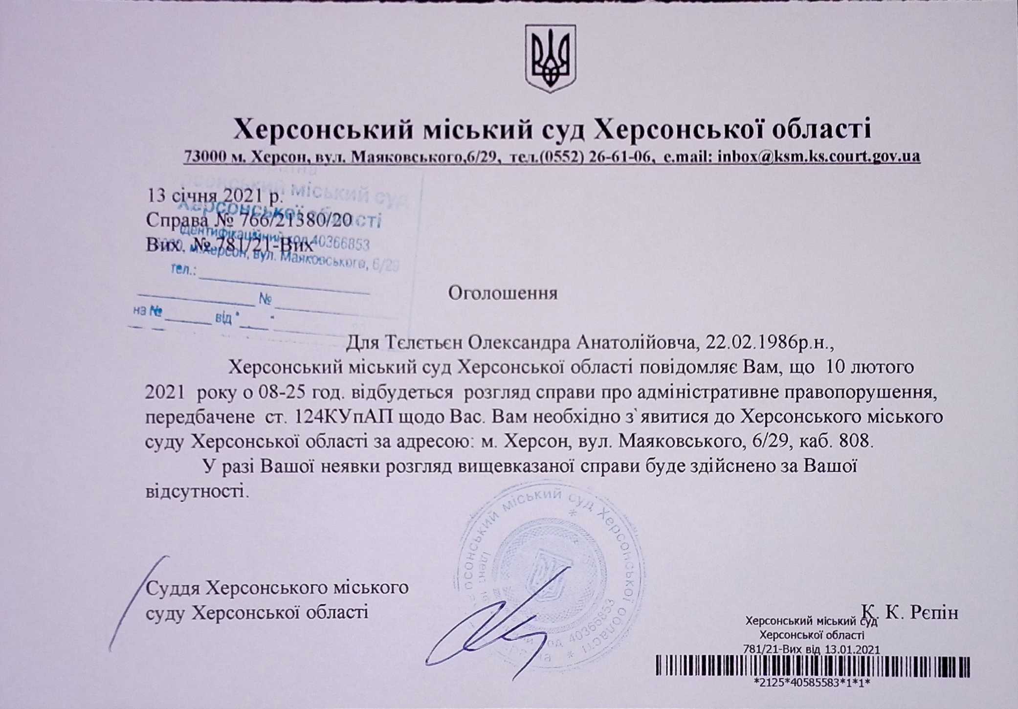 ОГОЛОШЕННЯ для Тєлєтьєн Олександра Анатолійовича