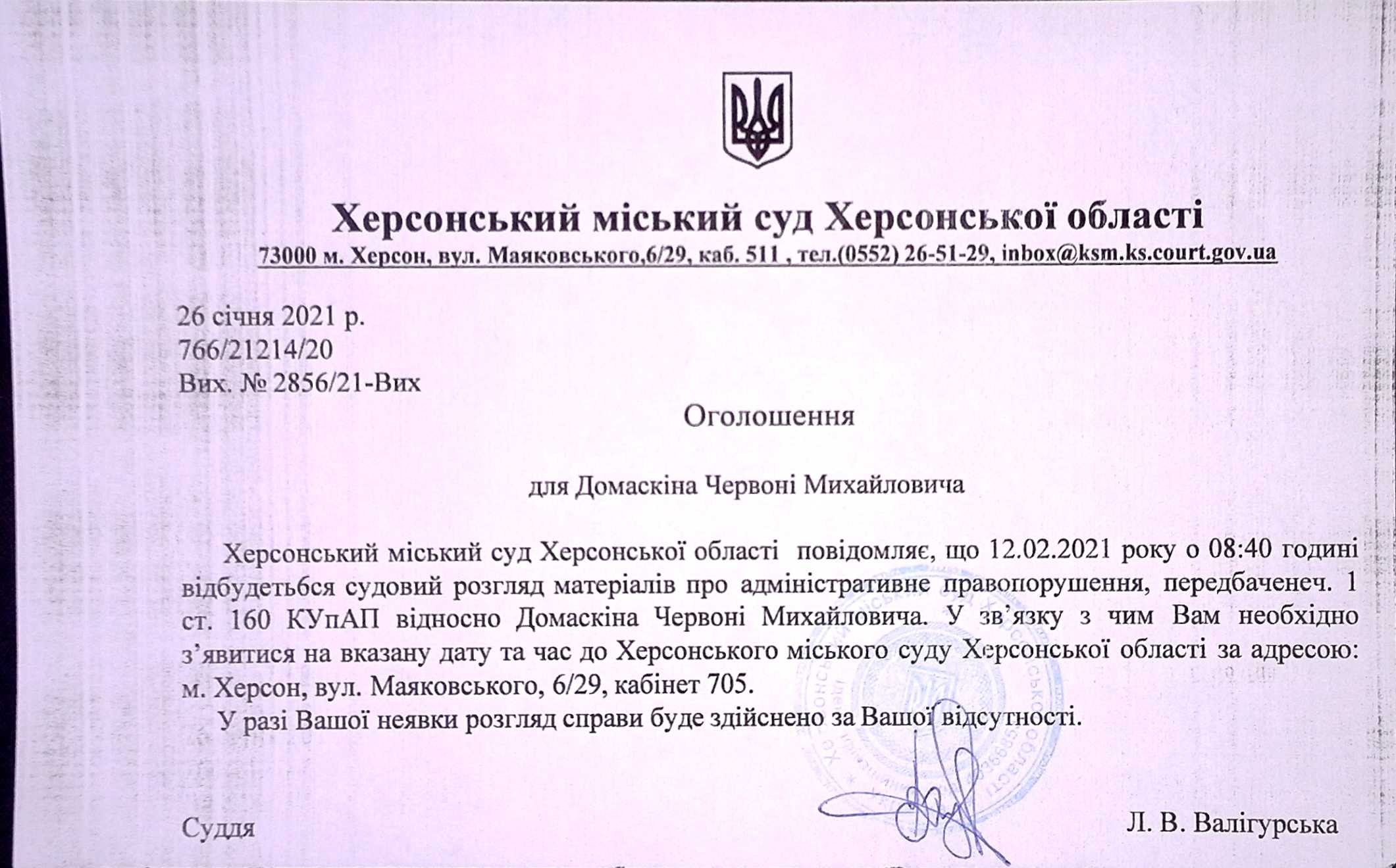 ОГОЛОШЕННЯ для Домаскіна Червоні Михайловича