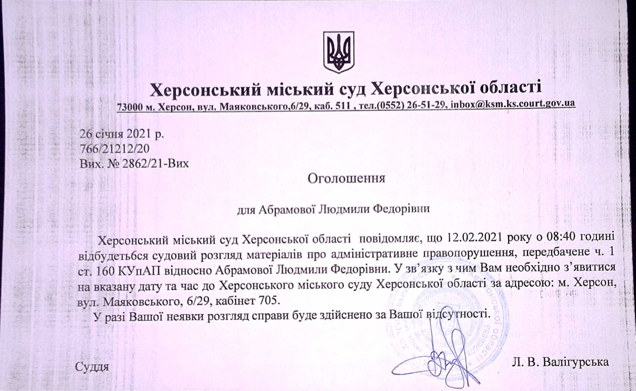 ОГОЛОШЕННЯ для Абрамової Людмили Федорівни
