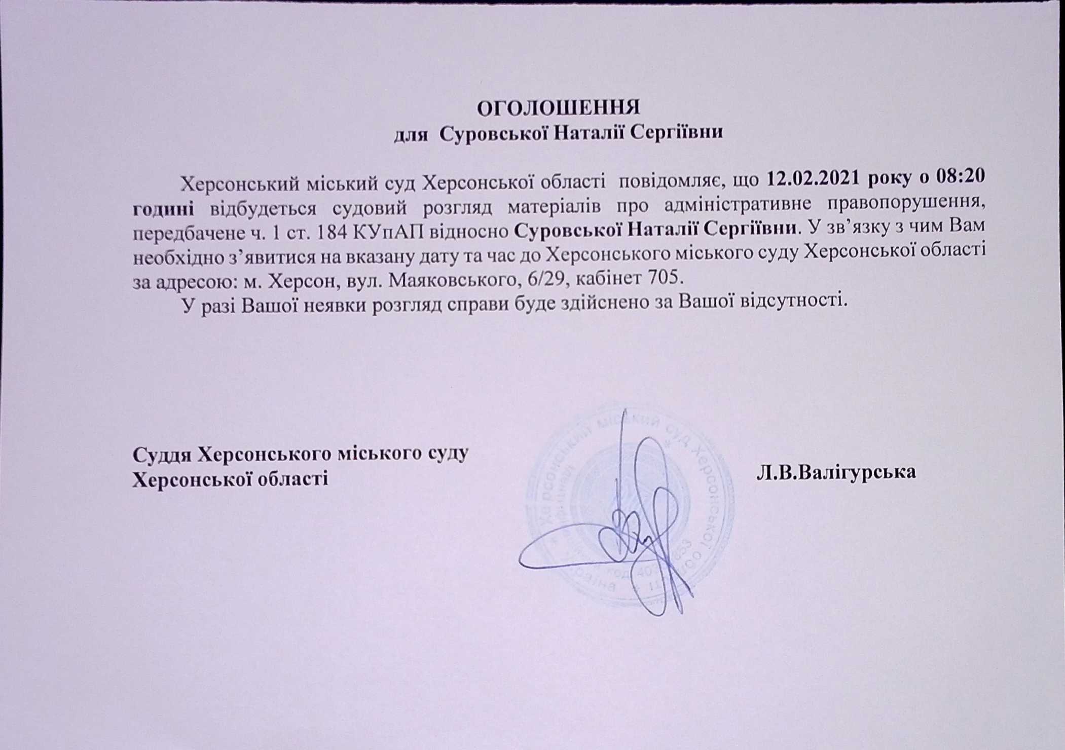 ОГОЛОШЕННЯ для Суровської Наталії Сергіївни