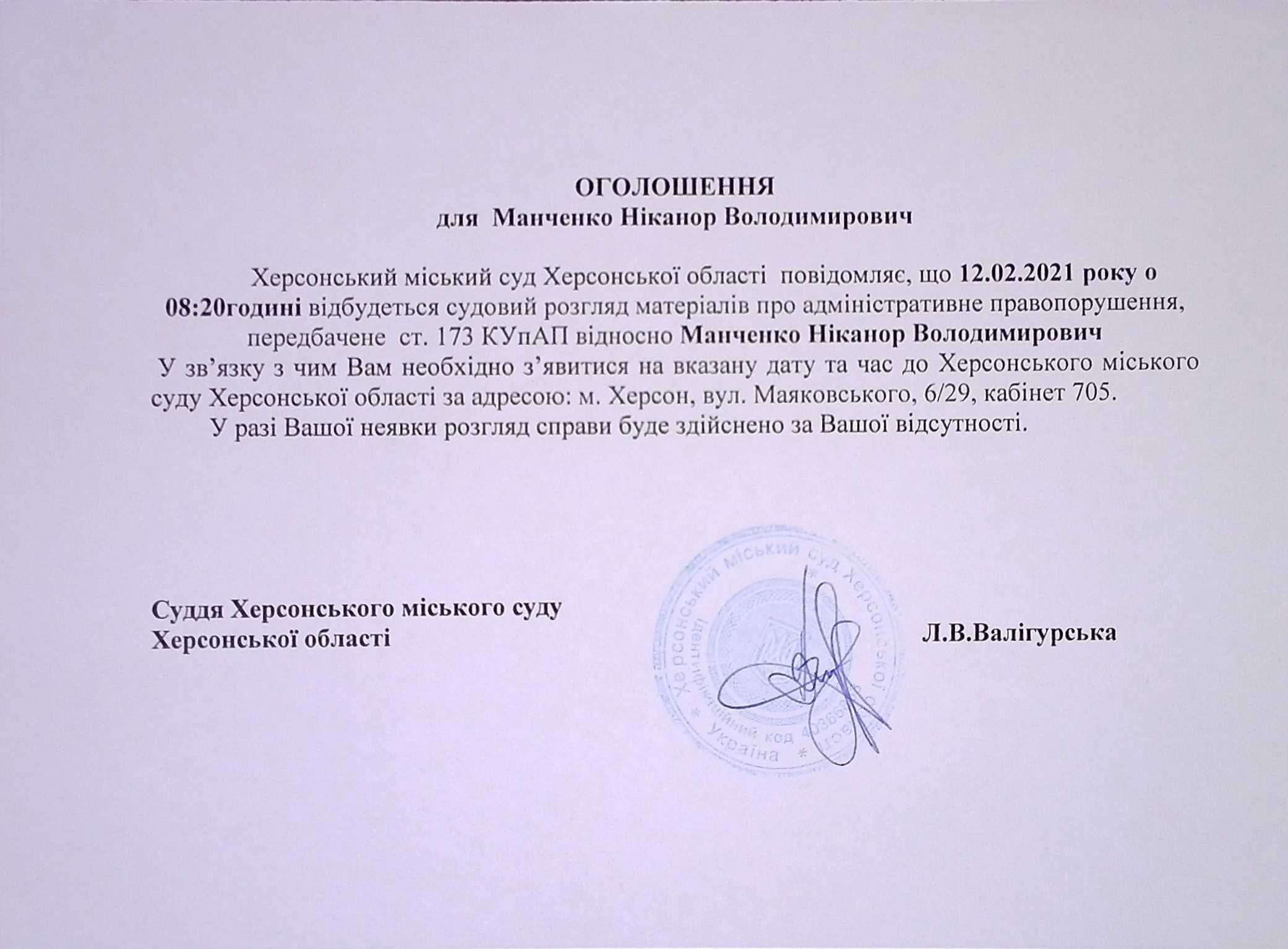 ОГОЛОШЕННЯ для Манченко Ніканора Володимировича