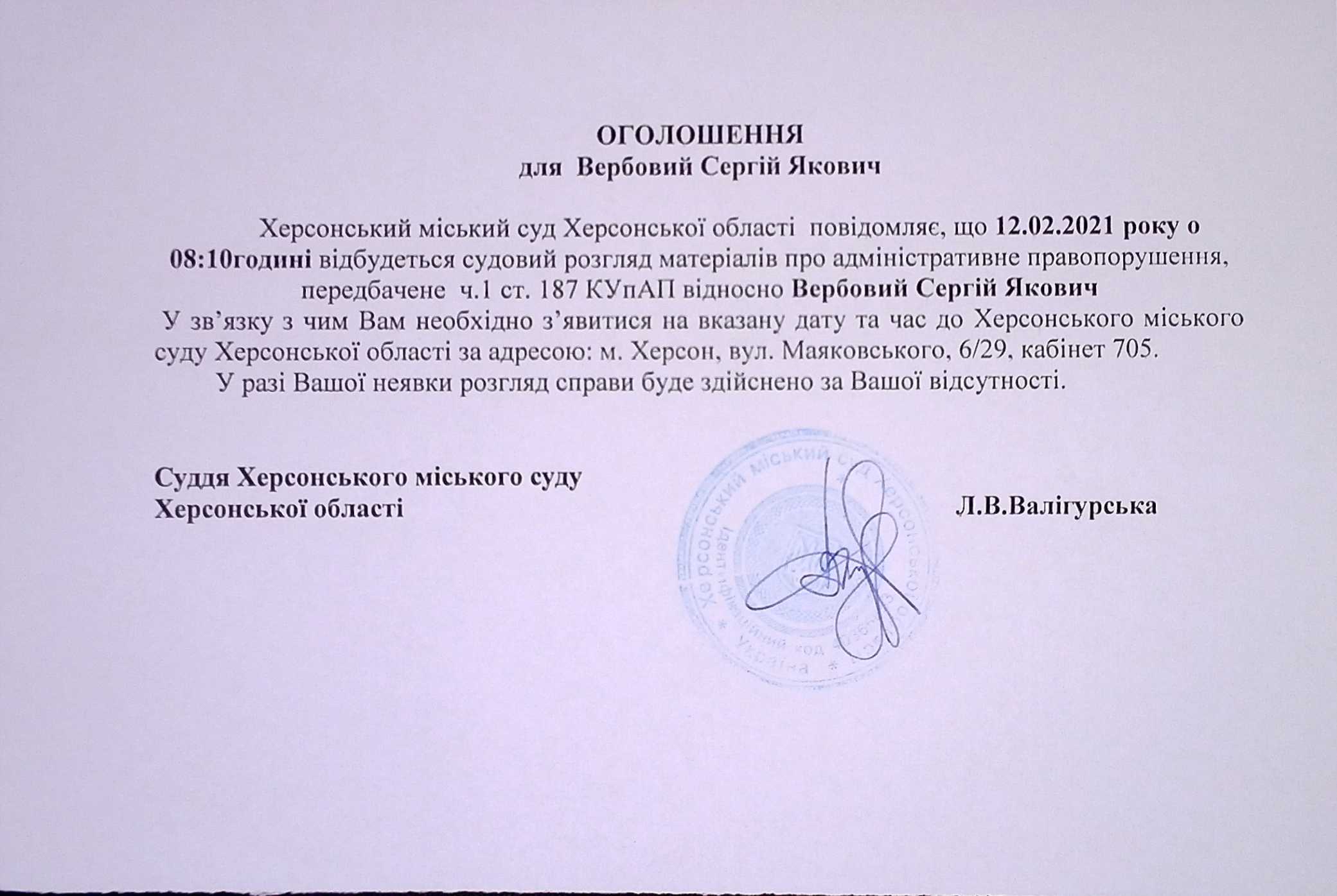 ОГОЛОШЕННЯ для Вербового Сергія Яковича