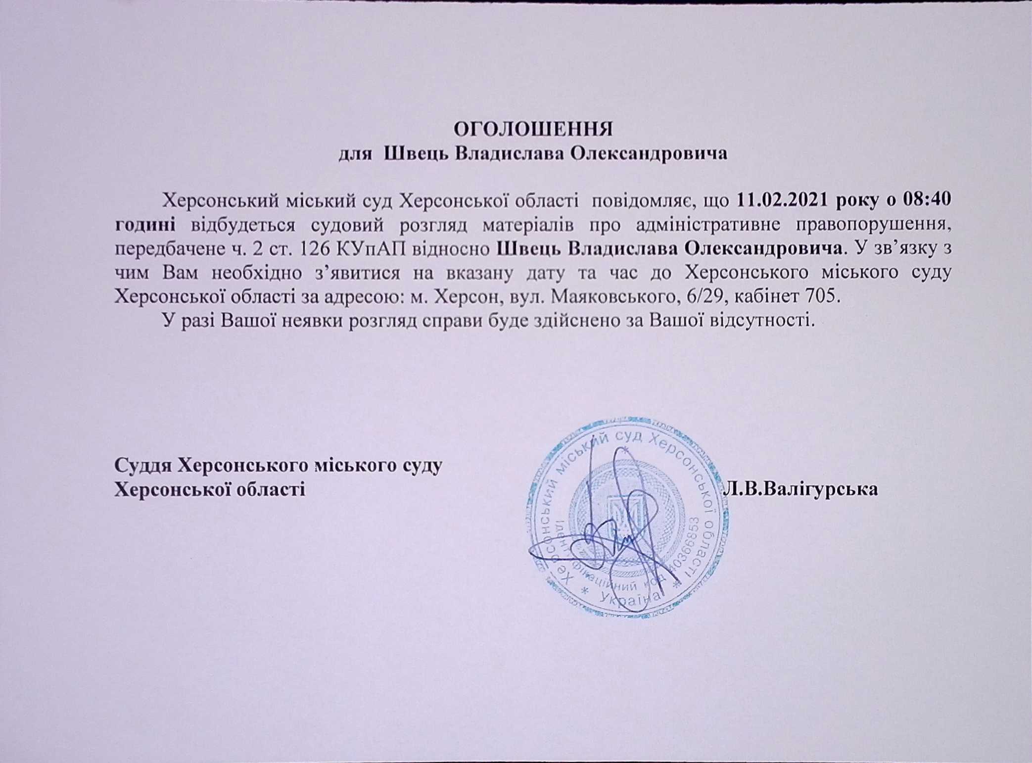 ОГОЛОШЕННЯ для Швець Владислава Олександровича