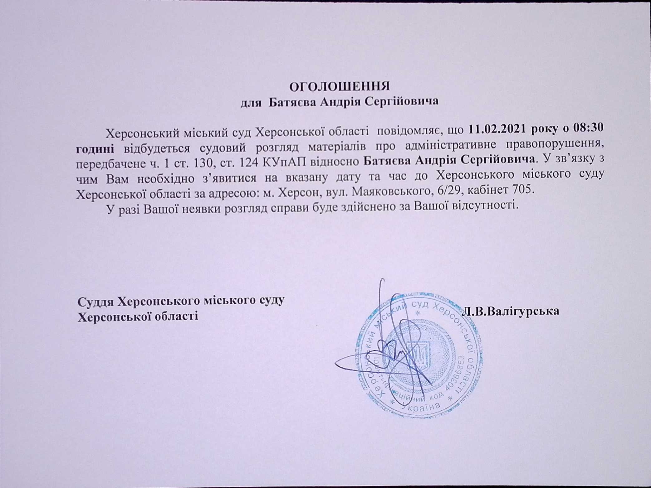 ОГОЛОШЕННЯ для Батяєва Андрія Сергійовича