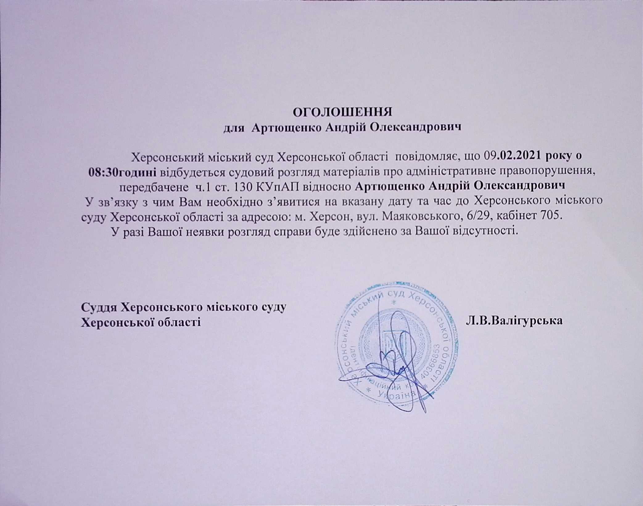 ОГОЛОШЕННЯ для Артющенка Андрія Олександровича