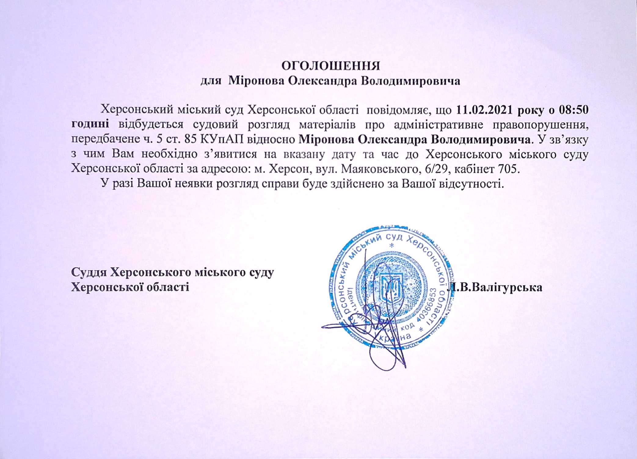 ОГОЛОШЕННЯ для Міронова Олександра Володимировича