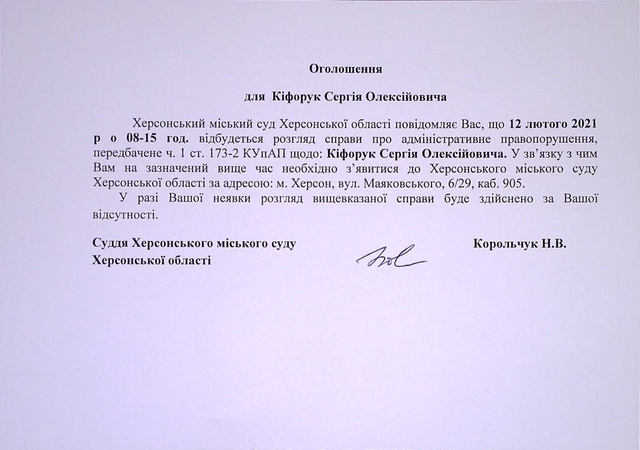 ОГОЛОШЕННЯ для Кіфорук Сергія Олексійовича