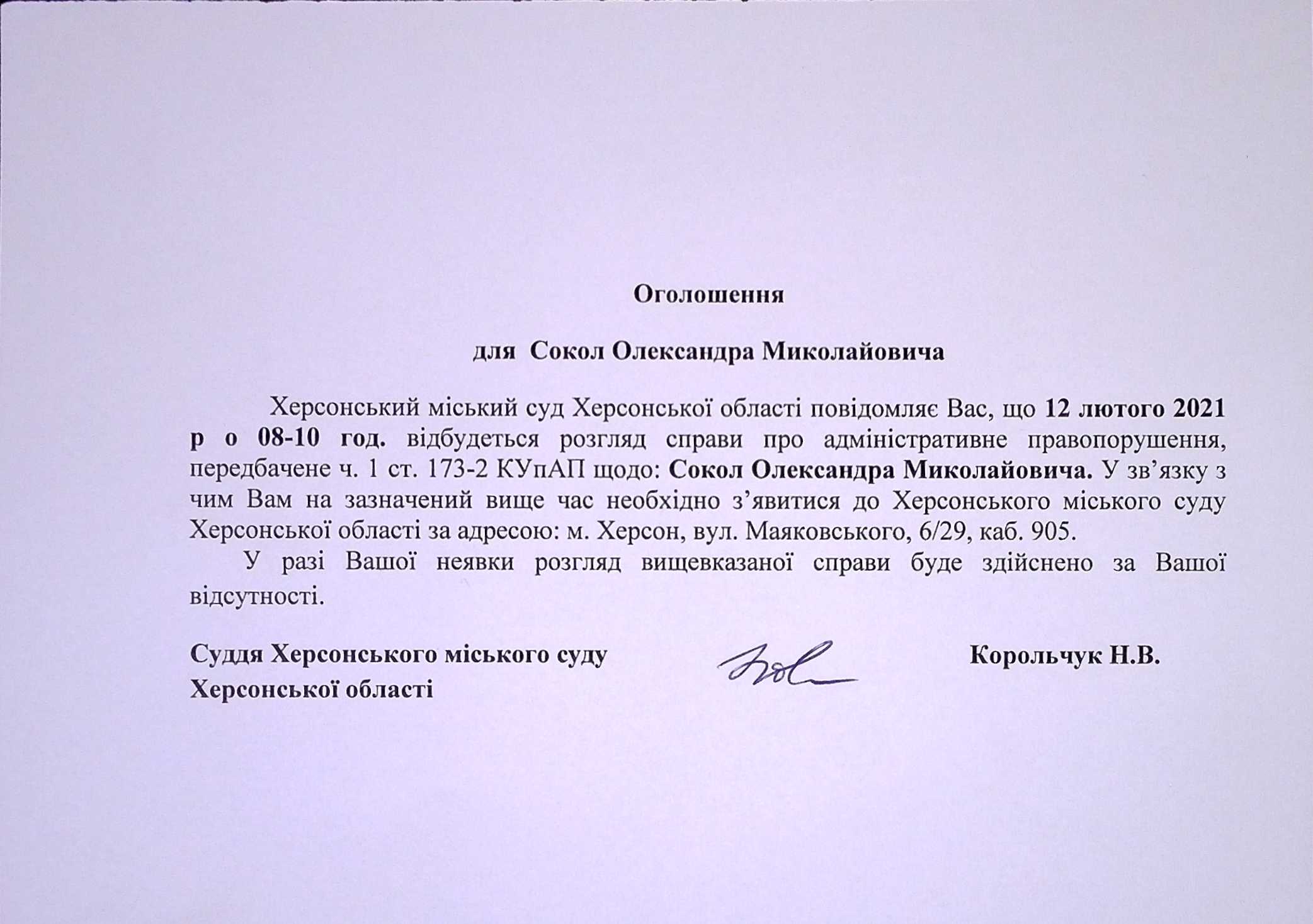 ОГОЛОШЕННЯ для Сокол Олександра Миколайовича