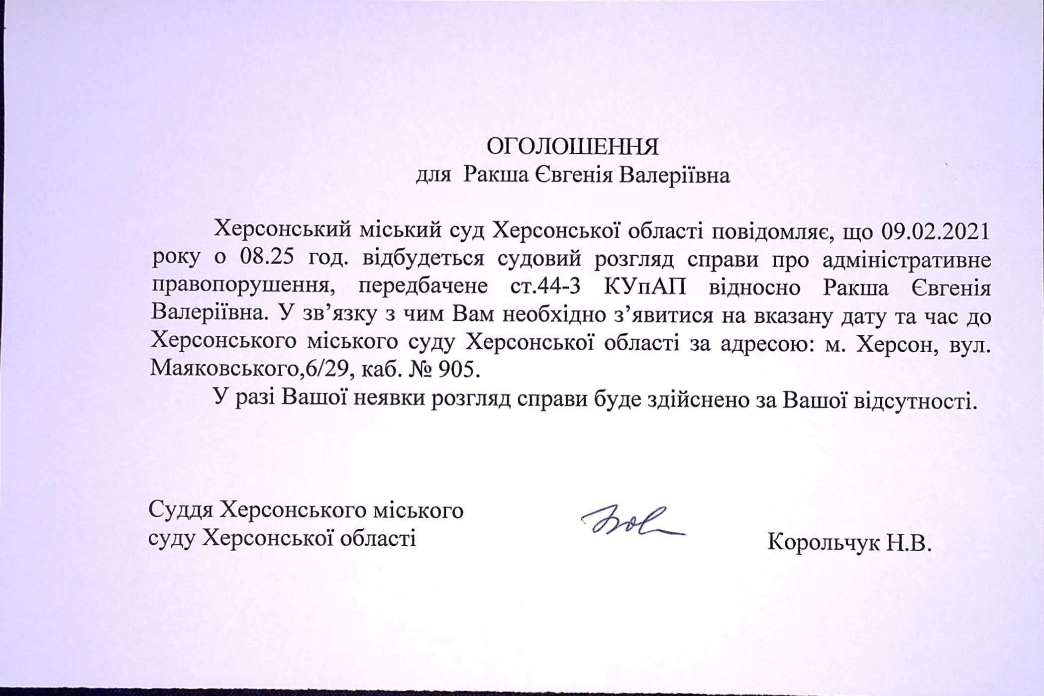 ОГОЛОШЕННЯ для Ракша Євгенії Валеріївни