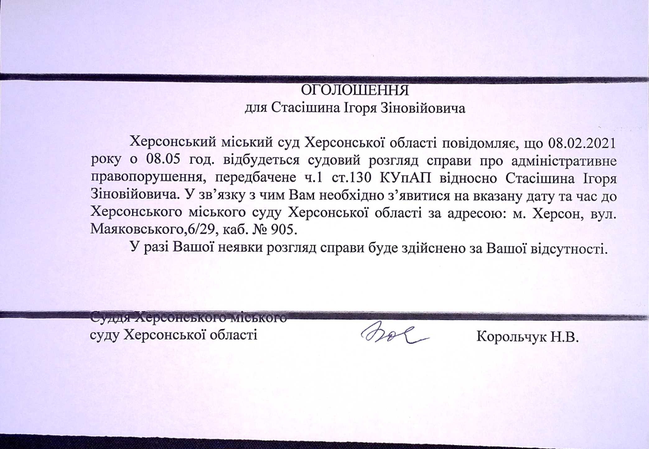 ОГОЛОШЕННЯ ПРО ВИКЛИК ДО СУДУ