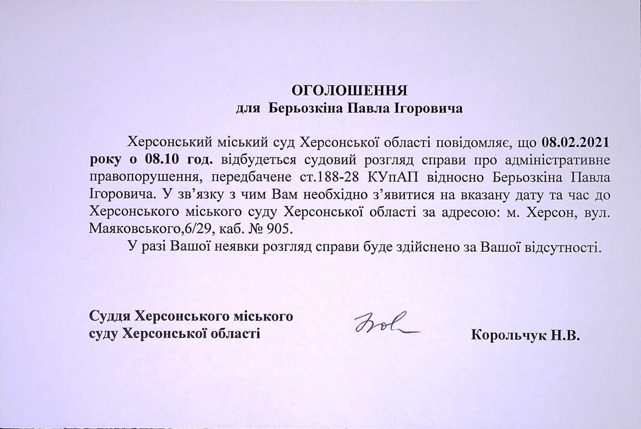 ОГОЛОШЕННЯ для Берьозкина Павла Ігоровича