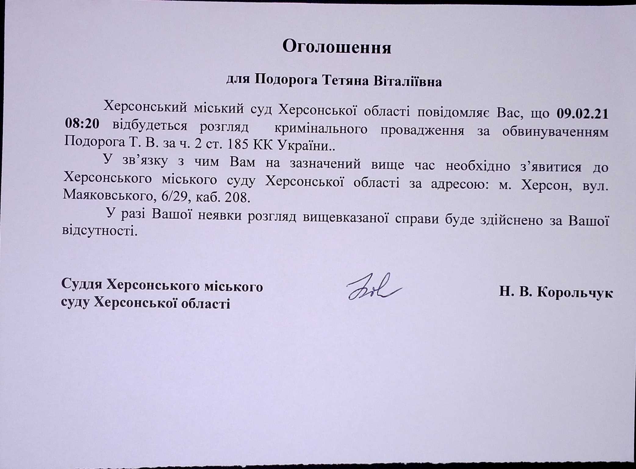 ОГОЛОШЕННЯ для Подороги Тетяни Віталіївни