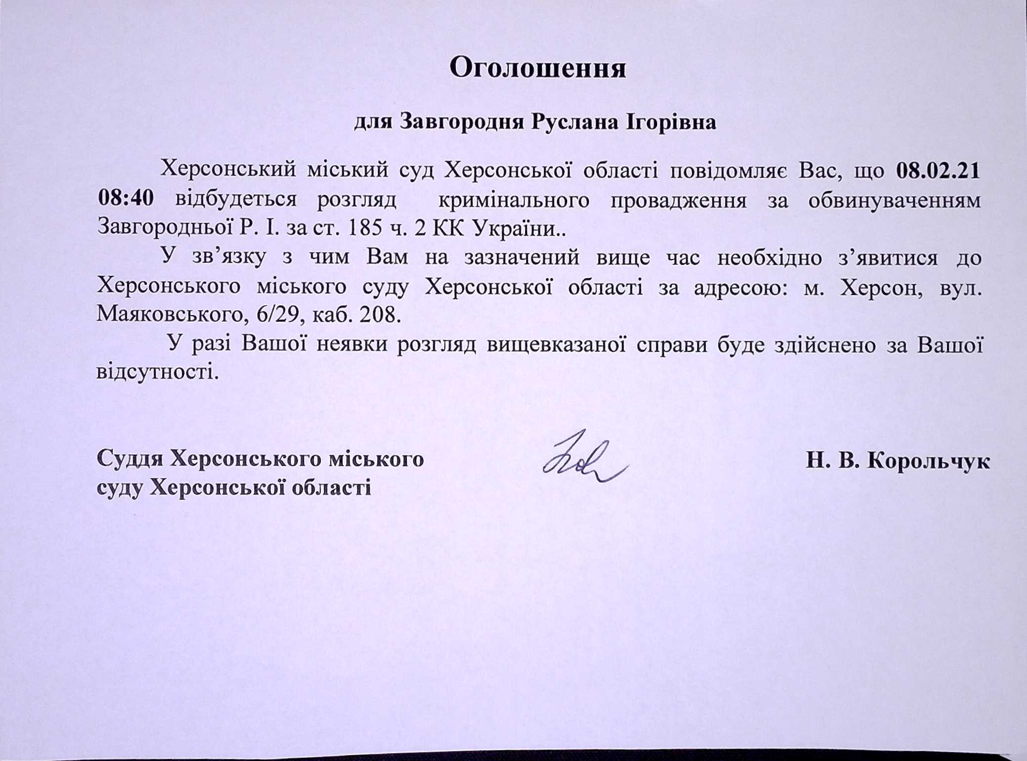 ОГОЛОШЕННЯ ПРО ВИКЛИК ДО СУДУ