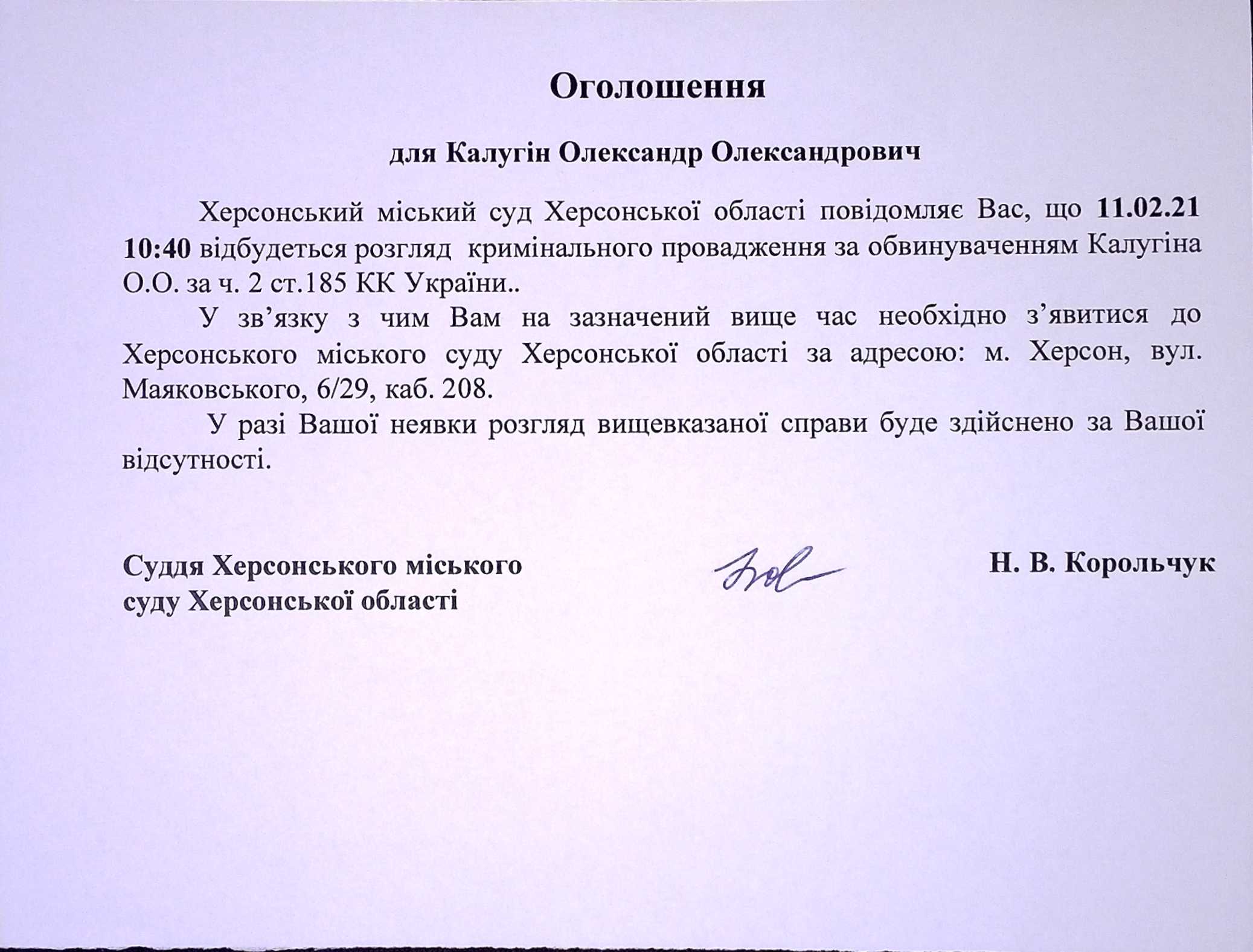 ОГОЛОШЕННЯ для Калугіна Олександра Олександровича