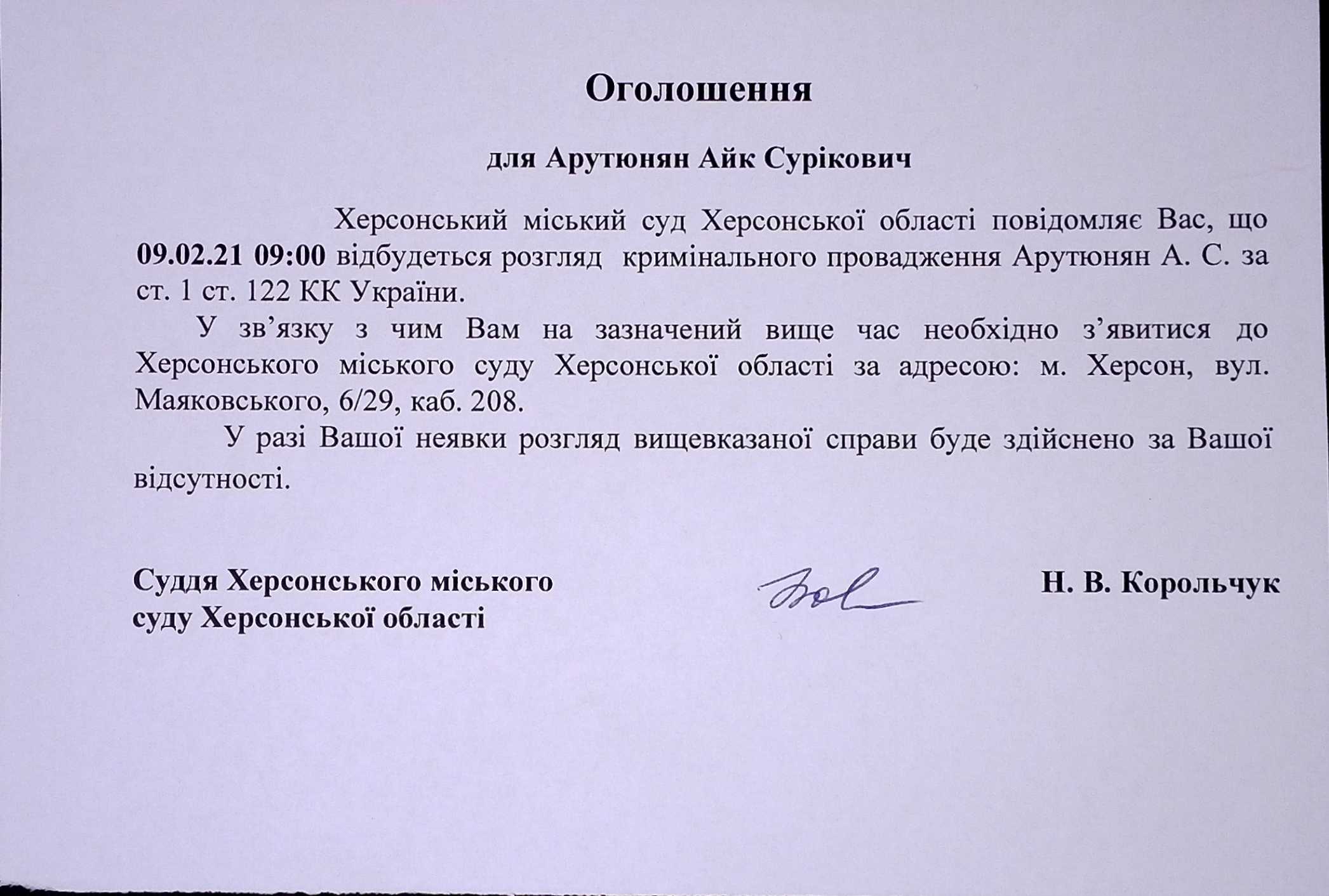 ОГОЛОШЕННЯ для Арутюнян Айк Сурікович