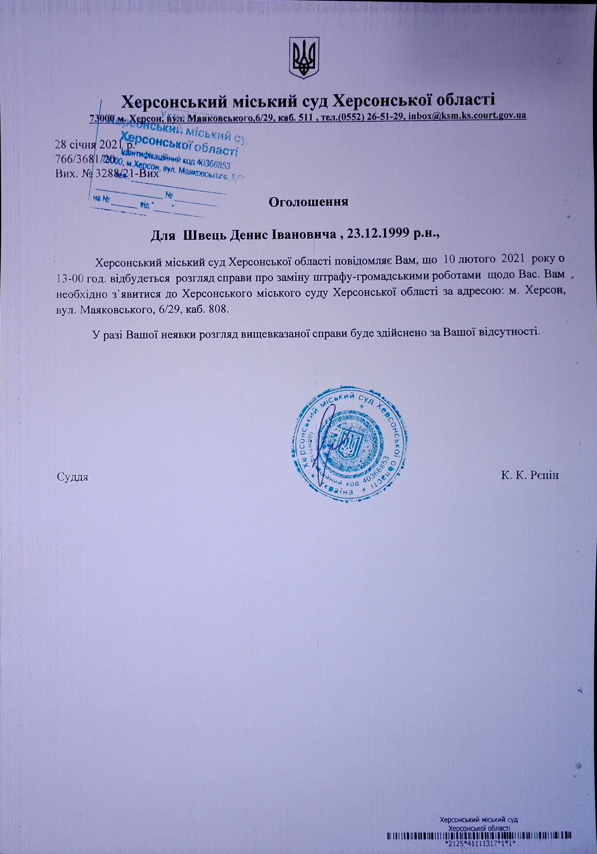 ОГОЛОШЕННЯ для Швець Дениса Івановича