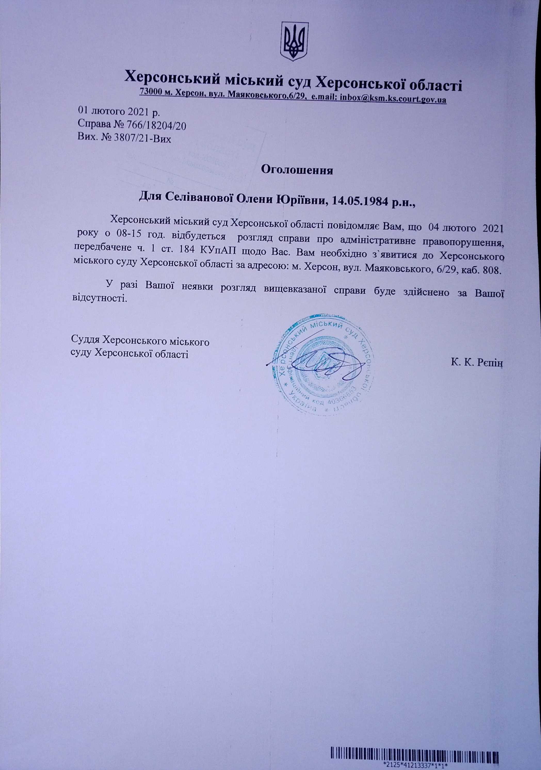 ОГОЛОШЕННЯ для Селіванової Олени Юріївни