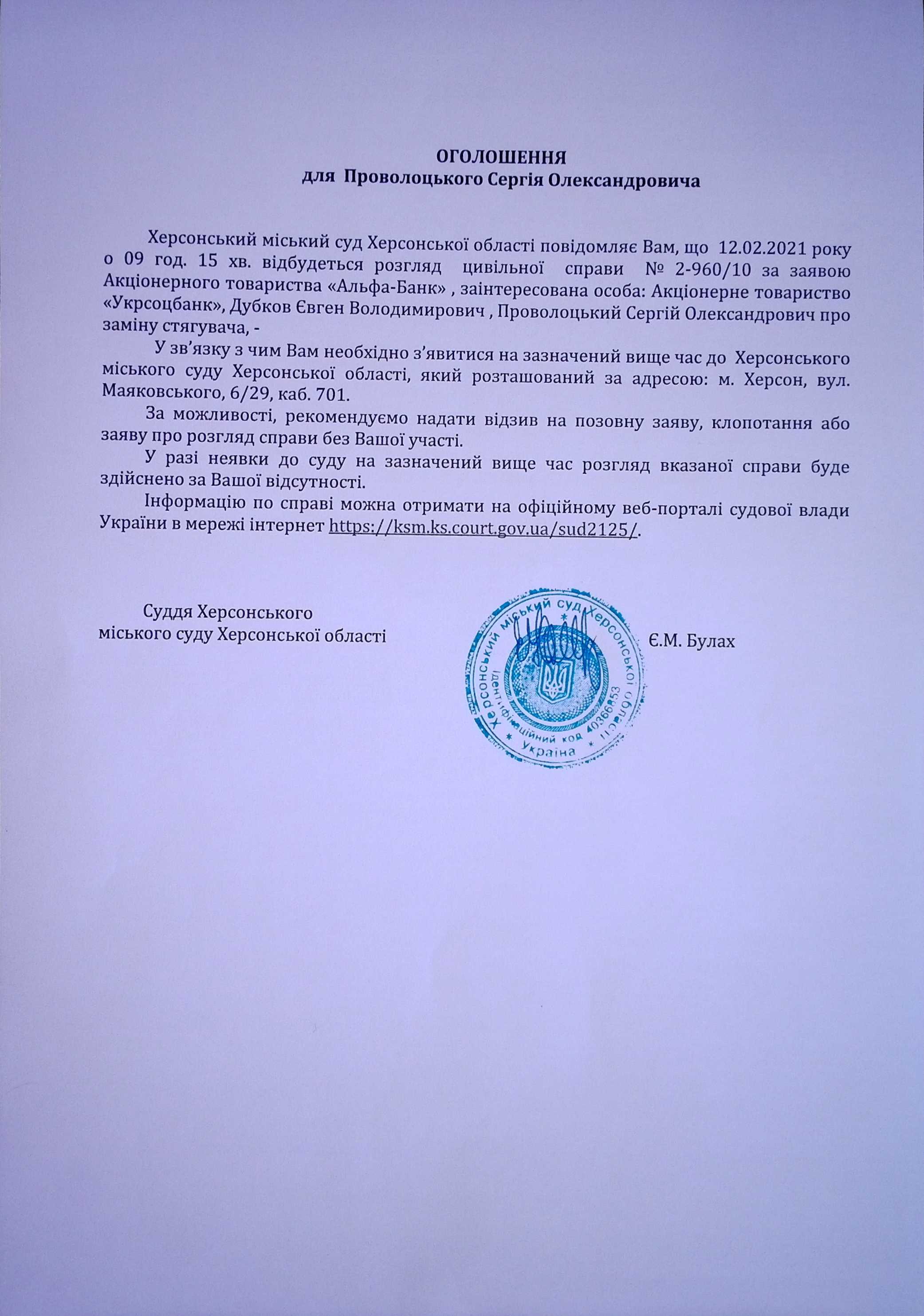 ОГОЛОШЕННЯ для Проволоцького Сергія Олександровича