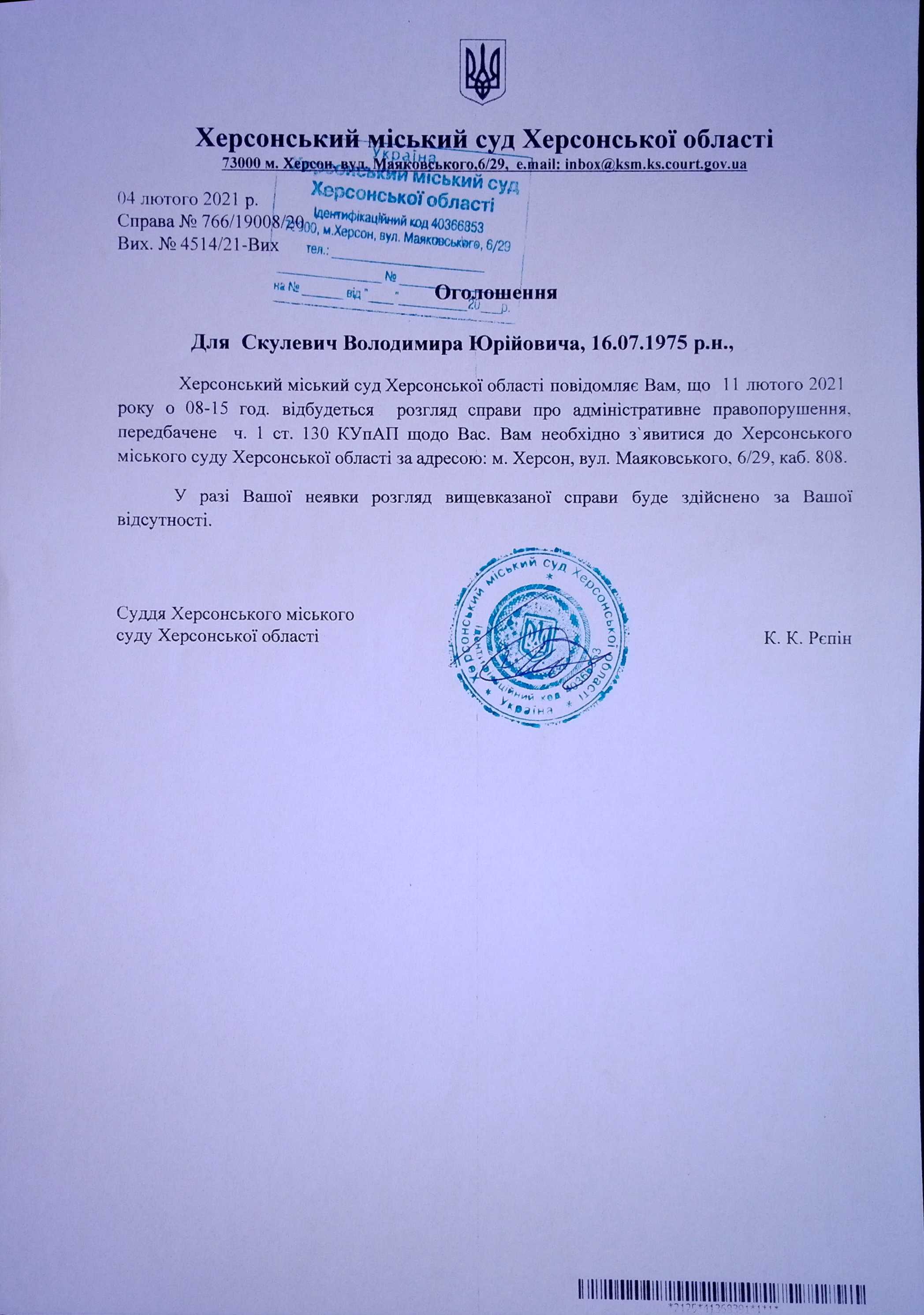 ОГОЛОШЕННЯ для Скулевич Володимира Юрійовича