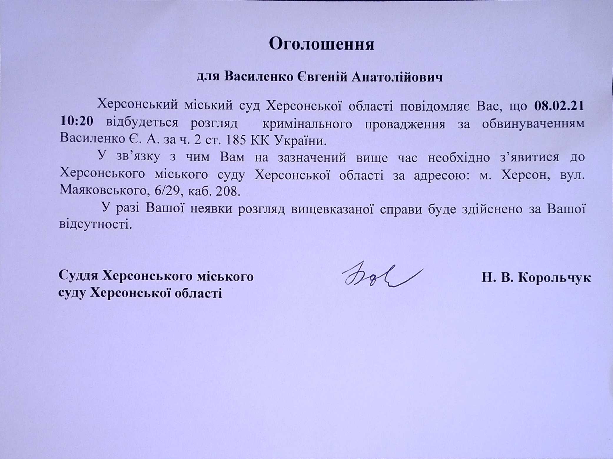 ОГОЛОШЕННЯ для Василенко Євгенія Анатолійовича